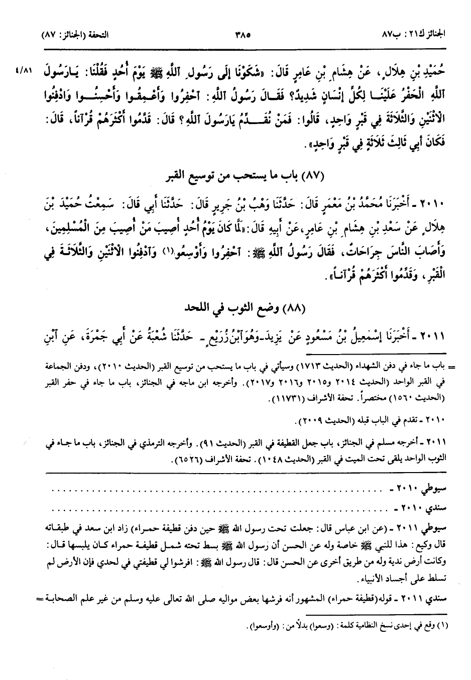 بَاب مَا يُسْتَحَبُّ مِنْ تَوْسِيعِ الْقَبْرِ 2010 - أَخْبَرَنَا مُحَمَّدُ بْنُ مَعْمَرٍ قَالَ حَدَّثَنَا وَهْبُ بْنُ جَرِيرٍ قَالَ حَدَّثَنَا أَبِي قَالَ سَمِعْتُ حُمَيْدَ بْنَ هِلَالٍ عَنْ سَعْدِ بْنِ هِشَامِ بْنِ عَامِرٍ عَنْ أَبِيهِ قَالَ لَمَّا كَانَ يَوْمُ أُحُدٍ أُصِيبَ مَنْ أُصِيبَ مِنْ الْمُسْلِمِينَ وَأَصَابَ النَّاسَ جِرَاحَاتٌ فَقَالَ رَسُولُ اللَّهِ صَلَّى اللَّهُ عَلَيْهِ وَسَلَّمَ احْفِرُوا وَأَوْسِعُوا وَادْفِنُوا الِاثْنَيْنِ وَالثَّلَاثَةَ فِي الْقَبْرِ وَقَدِّمُوا أَكْثَرَهُمْ قُرْآنًا