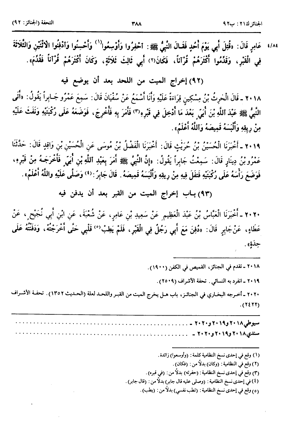 بَاب إِخْرَاجِ الْمَيِّتِ مَنْ الْقَبْرِ بَعْدَ أَنْ يُدْفَنَ فِيهِ 2020 - أَخْبَرَنَا الْعَبَّاسُ بْنُ عَبْدِ الْعَظِيمِ عَنْ سَعِيدِ بْنِ عَامِرٍ عَنْ شُعْبَةَ عَنْ ابْنِ أَبِي نَجِيحٍ عَنْ عَطَاءٍ عَنْ جَابِرٍ قَالَ دُفِنَ مَعَ أَبِي رَجُلٌ فِي الْقَبْرِ فَلَمْ يَطِبْ قَلْبِي حَتَّى أَخْرَجْتُهُ وَدَفَنْتُهُ عَلَى حِدَةٍ