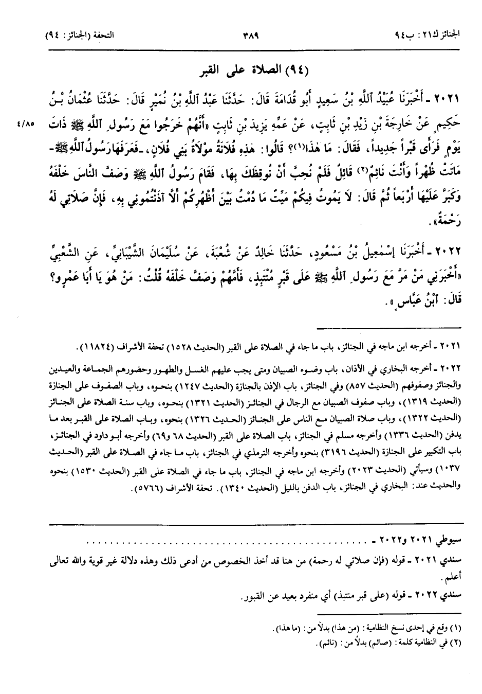الصَّلَاةُ عَلَى الْقَبْرِ 2021 - أَخْبَرَنَا عُبَيْدُ اللَّهِ بْنُ سَعِيدٍ أَبُو قُدَامَةَ قَالَ حَدَّثَنَا عَبْدُ اللَّهِ بْنُ نُمَيْرٍ قَالَ حَدَّثَنَا عُثْمَانُ بْنُ حَكِيمٍ عَنْ خَارِجَةَ بْنِ زَيْدِ بْنِ ثَابِتٍ عَنْ عَمِّهِ يَزِيدَ بْنِ ثَابِتٍ أَنَّهُمْ خَرَجُوا مَعَ رَسُولِ اللَّهِ صَلَّى اللَّهُ عَلَيْهِ وَسَلَّمَ ذَاتَ يَوْمٍ فَرَأَى قَبْرًا جَدِيدًا فَقَالَ مَا هَذَا قَالُوا هَذِهِ فُلَانَةُ مَوْلَاةُ بَنِي فُلَانٍ فَعَرَفَهَا رَسُولُ اللَّهِ صَلَّى اللَّهُ عَلَيْهِ وَسَلَّمَ مَاتَتْ ظُهْرًا وَأَنْتَ نَائِمٌ قَائِلٌ فَلَمْ نُحِبَّ أَنْ نُوقِظَكَ بِهَا فَقَامَ رَسُولُ اللَّهِ صَلَّى اللَّهُ عَلَيْهِ وَسَلَّمَ وَصَفَّ النَّاسَ خَلْفَهُ وَكَبَّرَ عَلَيْهَا أَرْبَعًا ثُمَّ قَالَ لَا يَمُوتُ فِيكُمْ مَيِّتٌ مَا دُمْتُ بَيْنَ أَظْهُرِكُمْ إِلَّا آذَنْتُمُونِي بِهِ فَإِنَّ صَلَاتِي لَهُ رَحْمَةٌ