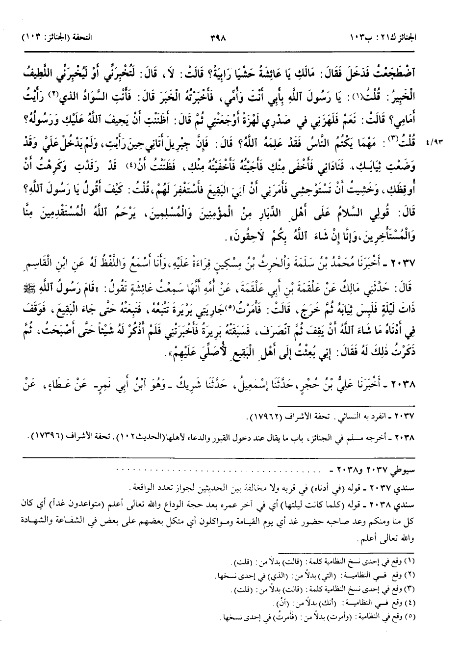 2038 - أَخْبَرَنَا عَلِيُّ بْنُ حُجْرٍ قَالَ حَدَّثَنَا إِسْمَعِيلُ قَالَ حَدَّثَنَا شَرِيكٌ وَهُوَ ابْنُ أَبِي نَمِرٍ عَنْ عَطَاءٍ عَنْ عَائِشَةَ قَالَتْ كَانَ رَسُولُ اللَّهِ صَلَّى اللَّهُ عَلَيْهِ وَسَلَّمَ كُلَّمَا كَانَتْ لَيْلَتُهَا مِنْ رَسُولِ اللَّهِ صَلَّى اللَّهُ عَلَيْهِ وَسَلَّمَ يَخْرُجُ فِي آخِرِ اللَّيْلِ إِلَى الْبَقِيعِ فَيَقُولُ السَّلَامُ عَلَيْكُمْ دَارَ قَوْمٍ مُؤْمِنِينَ وَإِنَّا وَإِيَّاكُمْ مُتَوَاعِدُونَ غَدًا أَوْ مُوَاكِلُونَ وَإِنَّا إِنْ شَاءَ اللَّهُ بِكُمْ لَاحِقُونَ اللَّهُمَّ اغْفِرْ لِأَهْلِ بَقِيعِ الْغَرْقَدِ