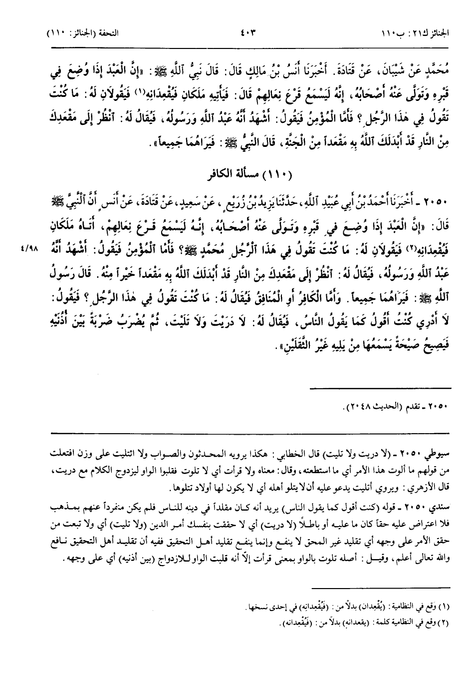 مَسْأَلَةُ الْكَافِرِ 2050 - أَخْبَرَنَا أَحْمَدُ بْنُ أَبِي عُبَيْدِ اللَّهِ قَالَ حَدَّثَنَا يَزِيدُ بْنُ زُرَيْعٍ عَنْ سَعِيدٍ عَنْ قَتَادَةَ عَنْ أَنَسٍ أَنَّ النَّبِيَّ صَلَّى اللَّهُ عَلَيْهِ وَسَلَّمَ قَالَ إِنَّ الْعَبْدَ إِذَا وُضِعَ فِي قَبْرِهِ وَتَوَلَّى عَنْهُ أَصْحَابُهُ إِنَّهُ لَيَسْمَعُ قَرْعَ نِعَالِهِمْ أَتَاهُ مَلَكَانِ فَيُقْعِدَانِهِ فَيَقُولَانِ لَهُ مَا كُنْتَ تَقُولُ فِي هَذَا الرَّجُلِ مُحَمَّدٍ صَلَّى اللَّهُ عَلَيْهِ وَسَلَّمَ فَأَمَّا الْمُؤْمِنُ فَيَقُولُ أَشْهَدُ أَنَّهُ عَبْدُ اللَّهِ وَرَسُولُهُ فَيُقَالُ لَهُ انْظُرْ إِلَى مَقْعَدِكَ مِنْ النَّارِ قَدْ أَبْدَلَكَ اللَّهُ بِهِ مَقْعَدًا خَيْرًا مِنْهُ قَالَ رَسُولُ اللَّهِ صَلَّى اللَّهُ عَلَيْهِ وَسَلَّمَ فَيَرَاهُمَا جَمِيعًا وَأَمَّا الْكَافِرُ أَوْ الْمُنَافِقُ فَيُقَالُ لَهُ مَا كُنْتَ تَقُولُ فِي هَذَا الرَّجُلِ فَيَقُولُ لَا أَدْرِي كُنْتُ أَقُولُ كَمَا يَقُولُ النَّاسُ فَيُقَالُ لَهُ لَا دَرَيْتَ وَلَا تَلَيْتَ ثُمَّ يُضْرَبُ ضَرْبَةً بَيْنَ أُذُنَيْهِ فَيَصِيحُ صَيْحَةً يَسْمَعُهَا مَنْ يَلِيهِ غَيْرُ الثَّقَلَيْنِ