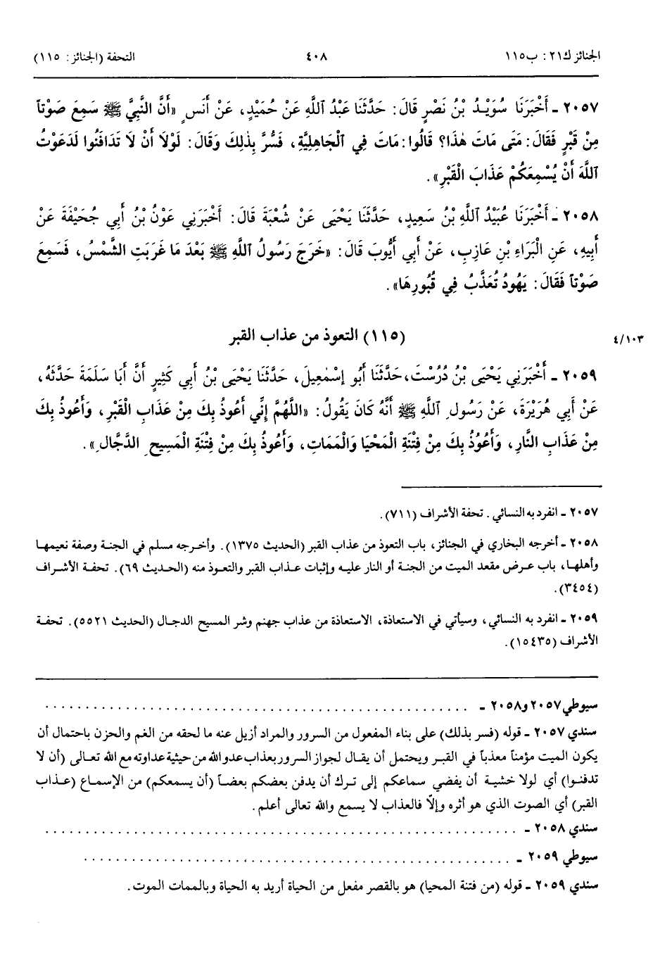 2057 - أَخْبَرَنَا سُوَيْدُ بْنُ نَصْرٍ قَالَ حَدَّثَنَا عَبْدُ اللَّهِ عَنْ حُمَيْدٍ عَنْ أَنَسٍ أَنَّ النَّبِيَّ صَلَّى اللَّهُ عَلَيْهِ وَسَلَّمَ سَمِعَ صَوْتًا مِنْ قَبْرٍ فَقَالَ مَتَى مَاتَ هَذَا قَالُوا مَاتَ فِي الْجَاهِلِيَّةِ فَسُرَّ بِذَلِكَ وَقَالَ لَوْلَا أَنْ لَا تَدَافَنُوا لَدَعَوْتُ اللَّهَ أَنْ يُسْمِعَكُمْ عَذَابَ الْقَبْرِ