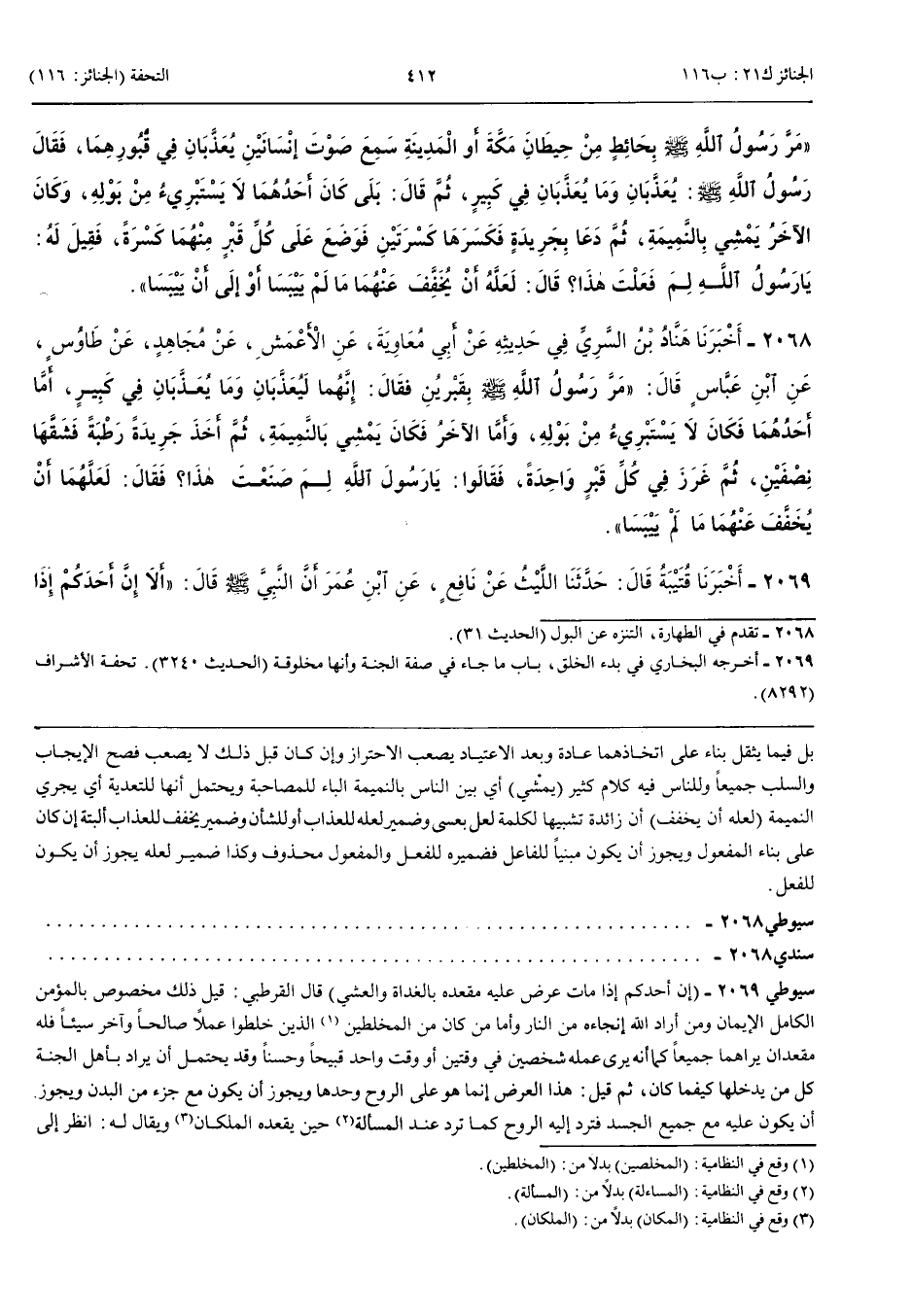 2068 - أَخْبَرَنَا هَنَّادُ بْنُ السَّرِيِّ فِي حَدِيثِهِ عَنْ أَبِي مُعَاوِيَةَ عَنْ الْأَعْمَشِ عَنْ مُجَاهِدٍ عَنْ طَاوُسٍ عَنْ ابْنِ عَبَّاسٍ قَالَ مَرَّ رَسُولُ اللَّهِ صَلَّى اللَّهُ عَلَيْهِ وَسَلَّمَ بِقَبْرَيْنِ فَقَالَ إِنَّهُمَا لَيُعَذَّبَانِ وَمَا يُعَذَّبَانِ فِي كَبِيرٍ أَمَّا أَحَدُهُمَا فَكَانَ لَا يَسْتَبْرِئُ مِنْ بَوْلِهِ وَأَمَّا الْآخَرُ فَكَانَ يَمْشِي بِالنَّمِيمَةِ ثُمَّ أَخَذَ جَرِيدَةً رَطْبَةً فَشَقَّهَا نِصْفَيْنِ ثُمَّ غَرَزَ فِي كُلِّ قَبْرٍ وَاحِدَةً فَقَالُوا يَا رَسُولَ اللَّهِ لِمَ صَنَعْتَ هَذَا فَقَالَ لَعَلَّهُمَا أَنْ يُخَفَّفَ عَنْهُمَا مَا لَمْ يَيْبَسَا