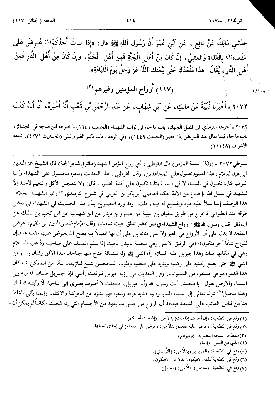 أَرْوَاحُ الْمُؤْمِنِينَ 2072 - أَخْبَرَنَا قُتَيْبَةُ عَنْ مَالِكٍ عَنْ ابْنِ شِهَابٍ عَنْ عَبْدِ الرَّحْمَنِ بْنِ كَعْبٍ أَنَّهُ أَخْبَرَهُ أَنَّ أَبَاهُ كَعْبَ بْنَ مَالِكٍ كَانَ يُحَدِّثُ عَنْ رَسُولِ اللَّهِ صَلَّى اللَّهُ عَلَيْهِ وَسَلَّمَ قَالَ إِنَّمَا نَسَمَةُ الْمُؤْمِنِ طَائِرٌ فِي شَجَرِ الْجَنَّةِ حَتَّى يَبْعَثَهُ اللَّهُ عَزَّ وَجَلَّ إِلَى جَسَدِهِ يَوْمَ الْقِيَامَةِ