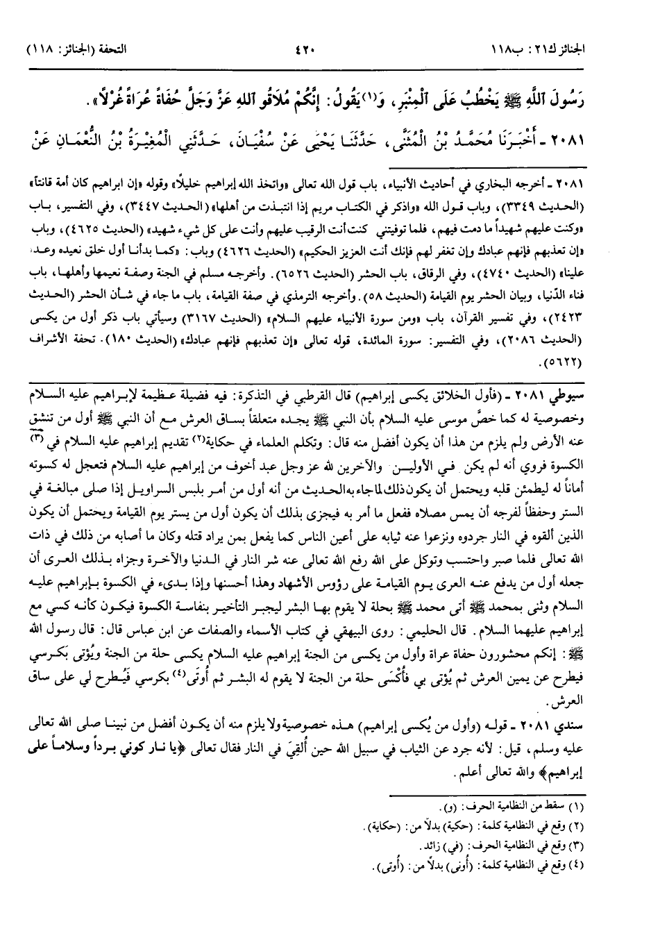 2081 - أَخْبَرَنَا مُحَمَّدُ بْنُ الْمُثَنَّى قَالَ حَدَّثَنَا يَحْيَى عَنْ سُفْيَانَ قَالَ حَدَّثَنِي الْمُغِيرَةُ بْنُ النُّعْمَانِ عَنْ سَعِيدِ بْنِ جُبَيْرٍ عَنْ ابْنِ عَبَّاسٍ عَنْ النَّبِيِّ صَلَّى اللَّهُ عَلَيْهِ وَسَلَّمَ قَالَ يُحْشَرُ النَّاسُ يَوْمَ الْقِيَامَةِ عُرَاةً غُرْلًا وَأَوَّلُ الْخَلَائِقِ يُكْسَى إِبْرَاهِيمُ عَلَيْهِ السَّلَام ثُمَّ قَرَأَ { كَمَا بَدَأْنَا أَوَّلَ خَلْقٍ نُعِيدُهُ }