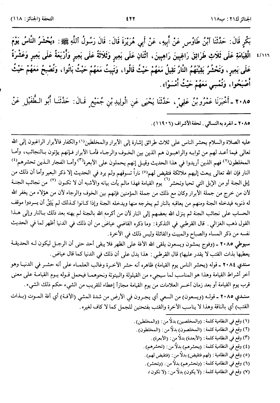 2085 - أَخْبَرَنَا عَمْرُو بْنُ عَلِيٍّ قَالَ حَدَّثَنَا يَحْيَى عَنْ الْوَلِيدِ بْنِ جُمَيْعٍ قَالَ حَدَّثَنَا أَبُو الطُّفَيْلِ عَنْ حُذَيْفَةَ بْنِ أَسِيدٍ عَنْ أَبِي ذَرٍّ قَالَ إِنَّ الصَّادِقَ الْمَصْدُوقَ صَلَّى اللَّهُ عَلَيْهِ وَسَلَّمَ حَدَّثَنِي أَنَّ النَّاسَ يُحْشَرُونَ ثَلَاثَةَ أَفْوَاجٍ فَوْجٌ رَاكِبِينَ طَاعِمِينَ كَاسِينَ وَفَوْجٌ تَسْحَبُهُمْ الْمَلَائِكَةُ عَلَى وُجُوهِهِمْ وَتَحْشُرُهُمْ النَّارُ وَفَوْجٌ يَمْشُونَ وَيَسْعَوْنَ يُلْقِي اللَّهُ الْآفَةَ عَلَى الظَّهْرِ فَلَا يَبْقَى حَتَّى إِنَّ الرَّجُلَ لَتَكُونُ لَهُ الْحَدِيقَةُ يُعْطِيهَا بِذَاتِ الْقَتَبِ لَا يَقْدِرُ عَلَيْهَا