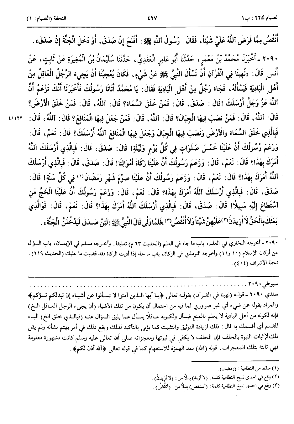 2090 - أَخْبَرَنَا مُحَمَّدُ بْنُ مَعْمَرٍ قَالَ حَدَّثَنَا أَبُو عَامِرٍ الْعَقَدِيُّ قَالَ حَدَّثَنَا سُلَيْمَانُ بْنُ الْمُغِيرَةِ عَنْ ثَابِتٍ عَنْ أَنَسٍ قَالَ نُهِينَا فِي الْقُرْآنِ أَنْ نَسْأَلَ النَّبِيَّ صَلَّى اللَّهُ عَلَيْهِ وَسَلَّمَ عَنْ شَيْءٍ فَكَانَ يُعْجِبُنَا أَنْ يَجِيءَ الرَّجُلُ الْعَاقِلُ مِنْ أَهْلِ الْبَادِيَةِ فَيَسْأَلَهُ فَجَاءَ رَجُلٌ مِنْ أَهْلِ الْبَادِيَةِ فَقَالَ يَا مُحَمَّدُ أَتَانَا رَسُولُكَ فَأَخْبَرَنَا أَنَّكَ تَزْعُمُ أَنَّ اللَّهَ عَزَّ وَجَلَّ أَرْسَلَكَ قَالَ صَدَقَ قَالَ فَمَنْ خَلَقَ السَّمَاءَ قَالَ اللَّهُ قَالَ فَمَنْ خَلَقَ الْأَرْضَ قَالَ اللَّهُ قَالَ فَمَنْ نَصَبَ فِيهَا الْجِبَالَ قَالَ اللَّهُ قَالَ فَمَنْ جَعَلَ فِيهَا الْمَنَافِعَ قَالَ اللَّهُ قَالَ فَبِالَّذِي خَلَقَ السَّمَاءَ وَالْأَرْضَ وَنَصَبَ فِيهَا الْجِبَالَ وَجَعَلَ فِيهَا الْمَنَافِعَ آللَّهُ أَرْسَلَكَ قَالَ نَعَمْ قَالَ وَزَعَمَ رَسُولُكَ أَنَّ عَلَيْنَا خَمْسَ صَلَوَاتٍ فِي كُلِّ يَوْمٍ وَلَيْلَةٍ قَالَ صَدَقَ قَالَ فَبِالَّذِي أَرْسَلَكَ آللَّهُ أَمَرَكَ بِهَذَا قَالَ نَعَمْ قَالَ وَزَعَمَ رَسُولُكَ أَنَّ عَلَيْنَا زَكَاةَ أَمْوَالِنَا قَالَ صَدَقَ قَالَ فَبِالَّذِي أَرْسَلَكَ آللَّهُ أَمَرَكَ بِهَذَا قَالَ نَعَمْ قَالَ وَزَعَمَ رَسُولُكَ أَنَّ عَلَيْنَا صَوْمَ شَهْرِ رَمَضَانَ فِي كُلِّ سَنَةٍ قَالَ صَدَقَ قَالَ فَبِالَّذِي أَرْسَلَكَ آللَّهُ أَمَرَكَ بِهَذَا قَالَ نَعَمْ قَالَ وَزَعَمَ رَسُولُكَ أَنَّ عَلَيْنَا الْحَجَّ مَنْ اسْتَطَاعَ إِلَيْهِ سَبِيلًا قَالَ صَدَقَ قَالَ فَبِالَّذِي أَرْسَلَكَ آللَّهُ أَمَرَكَ بِهَذَا قَالَ نَعَمْ قَالَ فَوَالَّذِي بَعَثَكَ بِالْحَقِّ لَا أَزِيدَنَّ عَلَيْهِنَّ شَيْئًا وَلَا أَنْقُصُ فَلَمَّا وَلَّى قَالَ النَّبِيُّ صَلَّى اللَّهُ عَلَيْهِ وَسَلَّمَ لَئِنْ صَدَقَ لَيَدْخُلَنَّ الْجَنَّةَ