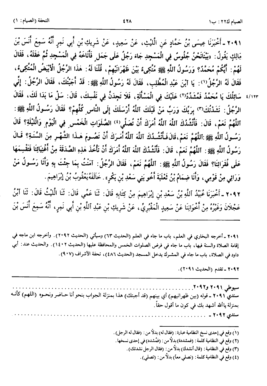 2092 - أَخْبَرَنَا عُبَيْدُ اللَّهِ بْنُ سَعْدِ بْنِ إِبْرَاهِيمَ مِنْ كِتَابِهِ قَالَ حَدَّثَنَا عَمِّي قَالَ حَدَّثَنَا اللَّيْثُ قَالَ حَدَّثَنَا ابْنُ عَجْلَانَ وَغَيْرُهُ مِنْ إِخْوَانِنَا عَنْ سَعِيدٍ الْمَقْبُرِيِّ عَنْ شَرِيكِ بْنِ عَبْدِ اللَّهِ بْنِ أَبِي نَمِرٍ أَنَّهُ سَمِعَ أَنَسَ بْنَ مَالِكٍ يَقُولُ بَيْنَمَا نَحْنُ عِنْدَ رَسُولِ اللَّهِ صَلَّى اللَّهُ عَلَيْهِ وَسَلَّمَ جُلُوسٌ فِي الْمَسْجِدِ دَخَلَ رَجُلٌ عَلَى جَمَلٍ فَأَنَاخَهُ فِي الْمَسْجِدِ ثُمَّ عَقَلَهُ ثُمَّ قَالَ أَيُّكُمْ مُحَمَّدٌ وَهُوَ مُتَّكِئٌ بَيْنَ ظَهْرَانَيْهِمْ فَقُلْنَا لَهُ هَذَا الرَّجُلُ الْأَبْيَضُ الْمُتَّكِئُ فَقَالَ لَهُ الرَّجُلُ يَا ابْنَ عَبْدِ الْمُطَّلِبِ فَقَالَ لَهُ رَسُولُ اللَّهِ صَلَّى اللَّهُ عَلَيْهِ وَسَلَّمَ قَدْ أَجَبْتُكَ قَالَ الرَّجُلُ يَا مُحَمَّدُ إِنِّي سَائِلُكَ فَمُشَدِّدٌ عَلَيْكَ فِي الْمَسْأَلَةِ قَالَ سَلْ عَمَّا بَدَا لَكَ قَالَ أَنْشُدُكَ بِرَبِّكَ وَرَبِّ مَنْ قَبْلَكَ آللَّهُ أَرْسَلَكَ إِلَى النَّاسِ كُلِّهِمْ فَقَالَ رَسُولُ اللَّهِ صَلَّى اللَّهُ عَلَيْهِ وَسَلَّمَ اللَّهُمَّ نَعَمْ قَالَ فَأَنْشُدُكَ اللَّهَ آللَّهُ أَمَرَكَ أَنْ تَصُومَ هَذَا الشَّهْرَ مِنْ السَّنَةِ قَالَ قَالَ رَسُولُ اللَّهِ صَلَّى اللَّهُ عَلَيْهِ وَسَلَّمَ اللَّهُمَّ نَعَمْ قَالَ فَأَنْشُدُكَ اللَّهَ آللَّهُ أَمَرَكَ أَنْ تَأْخُذَ هَذِهِ الصَّدَقَةَ مِنْ أَغْنِيَائِنَا فَتَقْسِمَهَا عَلَى فُقَرَائِنَا فَقَالَ رَسُولُ اللَّهِ صَلَّى اللَّهُ عَلَيْهِ وَسَلَّمَ اللَّهُمَّ نَعَمْ فَقَالَ الرَّجُلُ إِنِّي آمَنْتُ بِمَا جِئْتَ بِهِ وَأَنَا رَسُولُ مَنْ وَرَائِي مِنْ قَوْمِي وَأَنَا ضِمَامُ بْنُ ثَعْلَبَةَ أَخُو بَنِي سَعْدِ بْنِ بَكْرٍ خَالَفَهُ عُبَيْدُ اللَّهِ بْنُ عُمَرَ