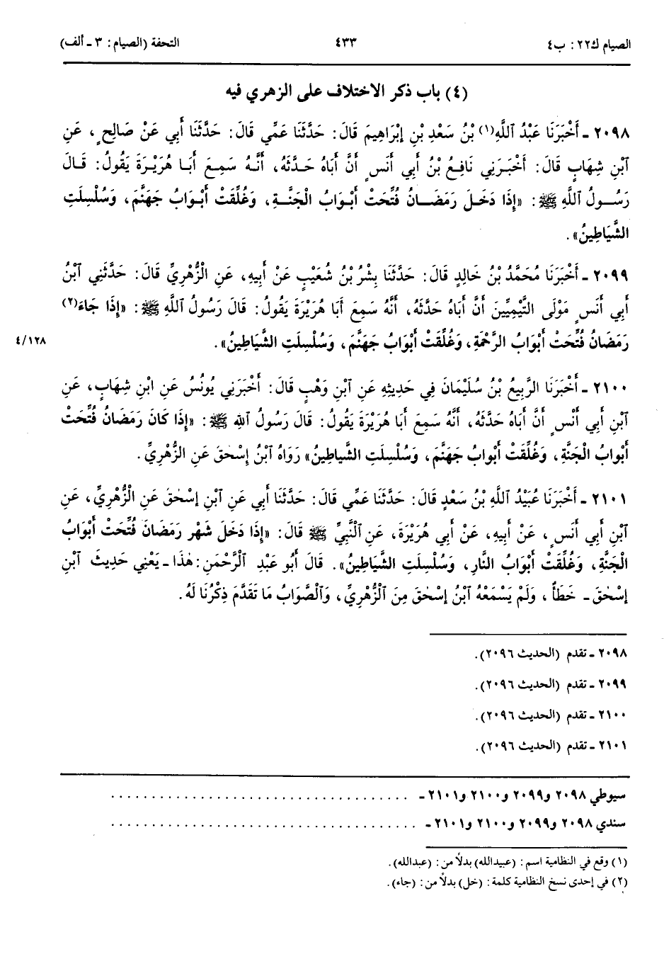 بَاب ذِكْرِ الِاخْتِلَافِ عَلَى الزُّهْرِيِّ فِيهِ 2098 - أَخْبَرَنَا عَبْدُ اللَّهِ بْنُ سَعْدِ بْنِ إِبْرَاهِيمَ قَالَ حَدَّثَنَا عَمِّي قَالَ حَدَّثَنَا أَبِي عَنْ صَالِحٍ عَنْ ابْنِ شِهَابٍ قَالَ أَخْبَرَنِي نَافِعُ بْنُ أَبِي أَنَسٍ أَنَّ أَبَاهُ حَدَّثَهُ أَنَّهُ سَمِعَ أَبَا هُرَيْرَةَ يَقُولُ قَالَ رَسُولُ اللَّهِ صَلَّى اللَّهُ عَلَيْهِ وَسَلَّمَ إِذَا دَخَلَ رَمَضَانُ فُتِّحَتْ أَبْوَابُ الْجَنَّةِ وَغُلِّقَتْ أَبْوَابُ جَهَنَّمَ وَسُلْسِلَتْ الشَّيَاطِينُ