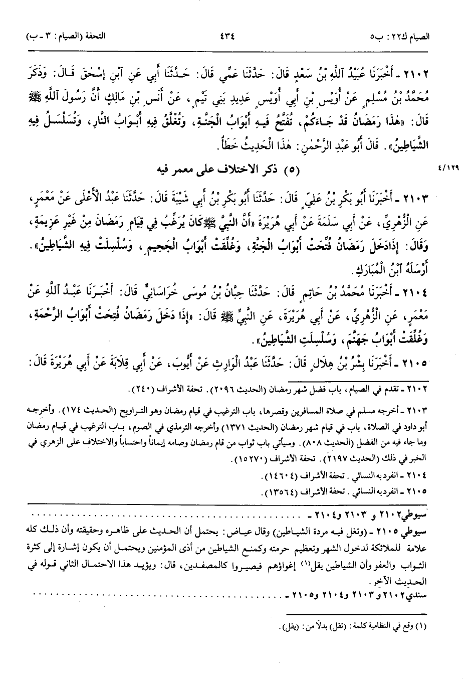 ذِكْرُ الِاخْتِلَافِ عَلَى مَعْمَرٍ فِيهِ 2103 - أَخْبَرَنَا أَبُو بَكْرِ بْنُ عَلِيٍّ قَالَ حَدَّثَنَا أَبُو بَكْرِ بْنُ أَبِي شَيْبَةَ قَالَ حَدَّثَنَا عَبْدُ الْأَعْلَى عَنْ مَعْمَرٍ عَنْ الزُّهْرِيِّ عَنْ أَبِي سَلَمَةَ عَنْ أَبِي هُرَيْرَةَ أَنَّ النَّبِيَّ صَلَّى اللَّهُ عَلَيْهِ وَسَلَّمَ كَانَ يُرَغِّبُ فِي قِيَامِ رَمَضَانَ مِنْ غَيْرِ عَزِيمَةٍ وَقَالَ إِذَا دَخَلَ رَمَضَانُ فُتِّحَتْ أَبْوَابُ الْجَنَّةِ وَغُلِّقَتْ أَبْوَابُ الْجَحِيمِ وَسُلْسِلَتْ فِيهِ الشَّيَاطِينُ أَرْسَلَهُ ابْنُ الْمُبَارَكِ