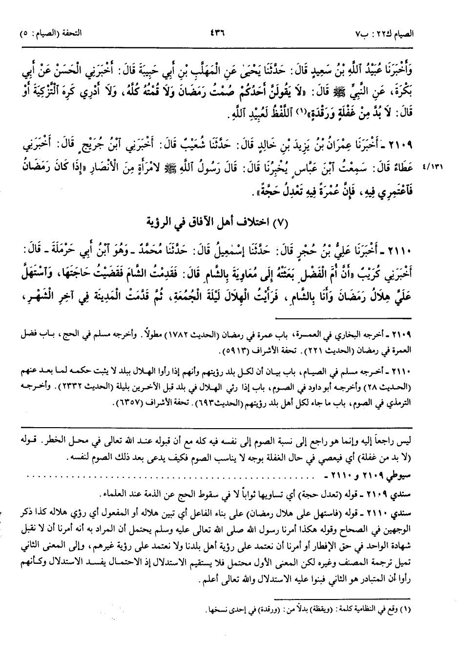 اخْتِلَافُ أَهْلِ الْآفَاقِ فِي الرُّؤْيَةِ 2110 - أَخْبَرَنَا عَلِيُّ بْنُ حُجْرٍ قَالَ حَدَّثَنَا إِسْمَعِيلُ قَالَ حَدَّثَنَا مُحَمَّدٌ وَهُوَ ابْنُ أَبِي حَرْمَلَةَ قَالَ أَخْبَرَنِي كُرَيْبٌ أَنَّ أُمَّ الْفَضْلِ بَعَثَتْهُ إِلَى مُعَاوِيَةَ بِالشَّامِ قَالَ فَقَدِمْتُ الشَّامَ فَقَضَيْتُ حَاجَتَهَا وَاسْتَهَلَّ عَلَيَّ هِلَالُ رَمَضَانَ وَأَنَا بِالشَّامِ فَرَأَيْتُ الْهِلَالَ لَيْلَةَ الْجُمُعَةِ ثُمَّ قَدِمْتُ الْمَدِينَةَ فِي آخِرِ الشَّهْرِ فَسَأَلَنِي عَبْدُ اللَّهِ بْنُ عَبَّاسٍ ثُمَّ ذَكَرَ الْهِلَالَ فَقَالَ مَتَى رَأَيْتُمْ فَقُلْتُ رَأَيْنَاهُ لَيْلَةَ الْجُمُعَةِ قَالَ أَنْتَ رَأَيْتَهُ لَيْلَةَ الْجُمُعَةِ قُلْتُ نَعَمْ وَرَآهُ النَّاسُ فَصَامُوا وَصَامَ مُعَاوِيَةُ قَالَ لَكِنْ رَأَيْنَاهُ لَيْلَةَ السَّبْتِ فَلَا نَزَالُ نَصُومُ حَتَّى نُكْمِلَ ثَلَاثِينَ يَوْمًا أَوْ نَرَاهُ فَقُلْتُ أَوَ لَا تَكْتَفِي بِرُؤْيَةِ مُعَاوِيَةَ وَأَصْحَابِهِ قَالَ لَا هَكَذَا أَمَرَنَا رَسُولُ اللَّهِ صَلَّى اللَّهُ عَلَيْهِ وَسَلَّمَ
