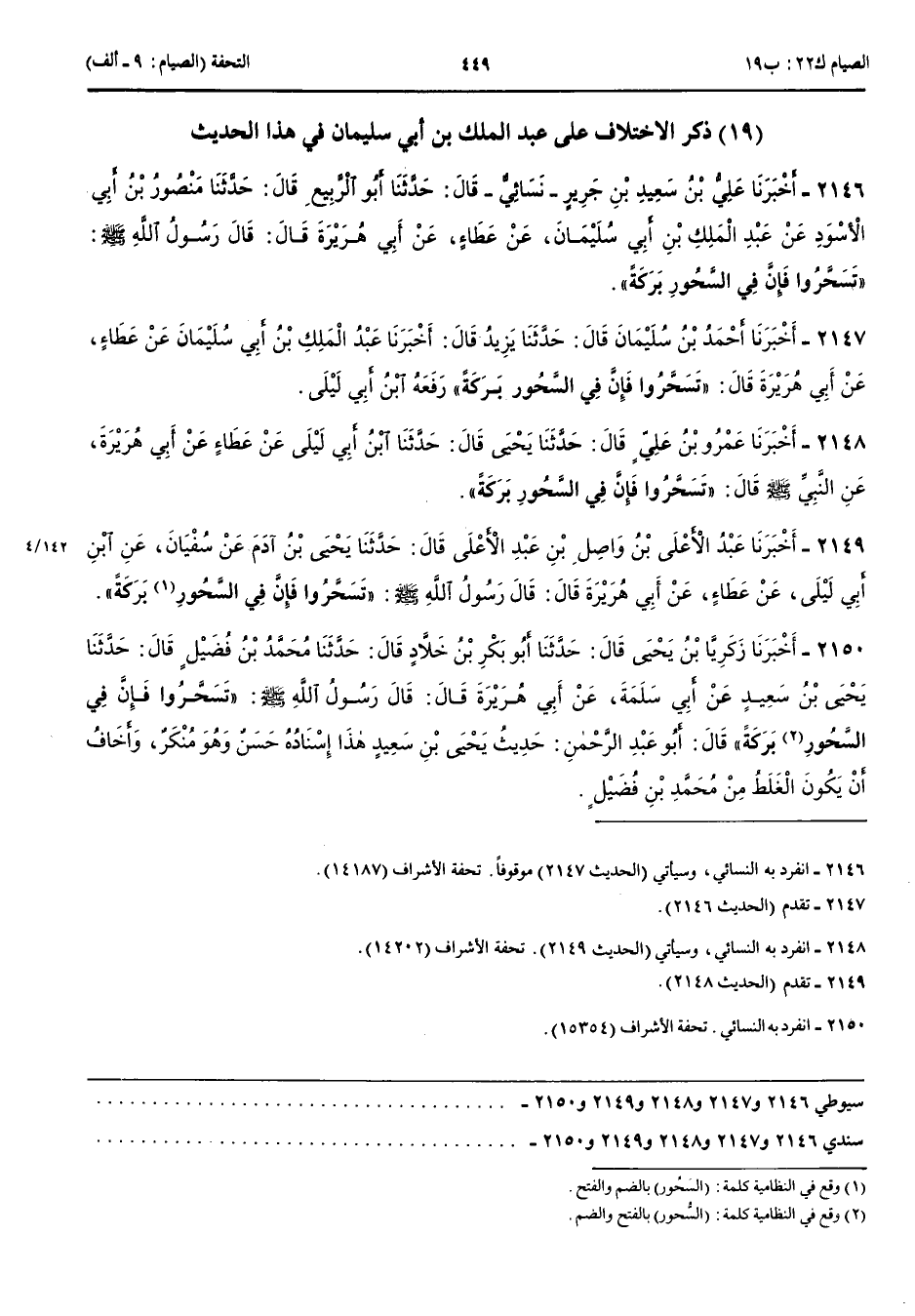 2150 - أَخْبَرَنَا زَكَرِيَّا بْنُ يَحْيَى قَالَ حَدَّثَنَا أَبُو بَكْرِ بْنُ خَلَّادٍ قَالَ حَدَّثَنَا مُحَمَّدُ بْنُ فُضَيْلٍ قَالَ حَدَّثَنَا يَحْيَى بْنُ سَعِيدٍ عَنْ أَبِي سَلَمَةَ عَنْ أَبِي هُرَيْرَةَ قَالَ قَالَ رَسُولُ اللَّهِ صَلَّى اللَّهُ عَلَيْهِ وَسَلَّمَ تَسَحَّرُوا فَإِنَّ فِي السَّحُورِ بَرَكَةً قَالَ أَبُو عَبْد الرَّحْمَنِ حَدِيثُ يَحْيَى بْنِ سَعِيدٍ هَذَا إِسْنَادُهُ حَسَنٌ وَهُوَ مُنْكَرٌ وَأَخَافُ أَنْ يَكُونَ الْغَلَطُ مِنْ مُحَمَّدِ بْنِ فُضَيْلٍ