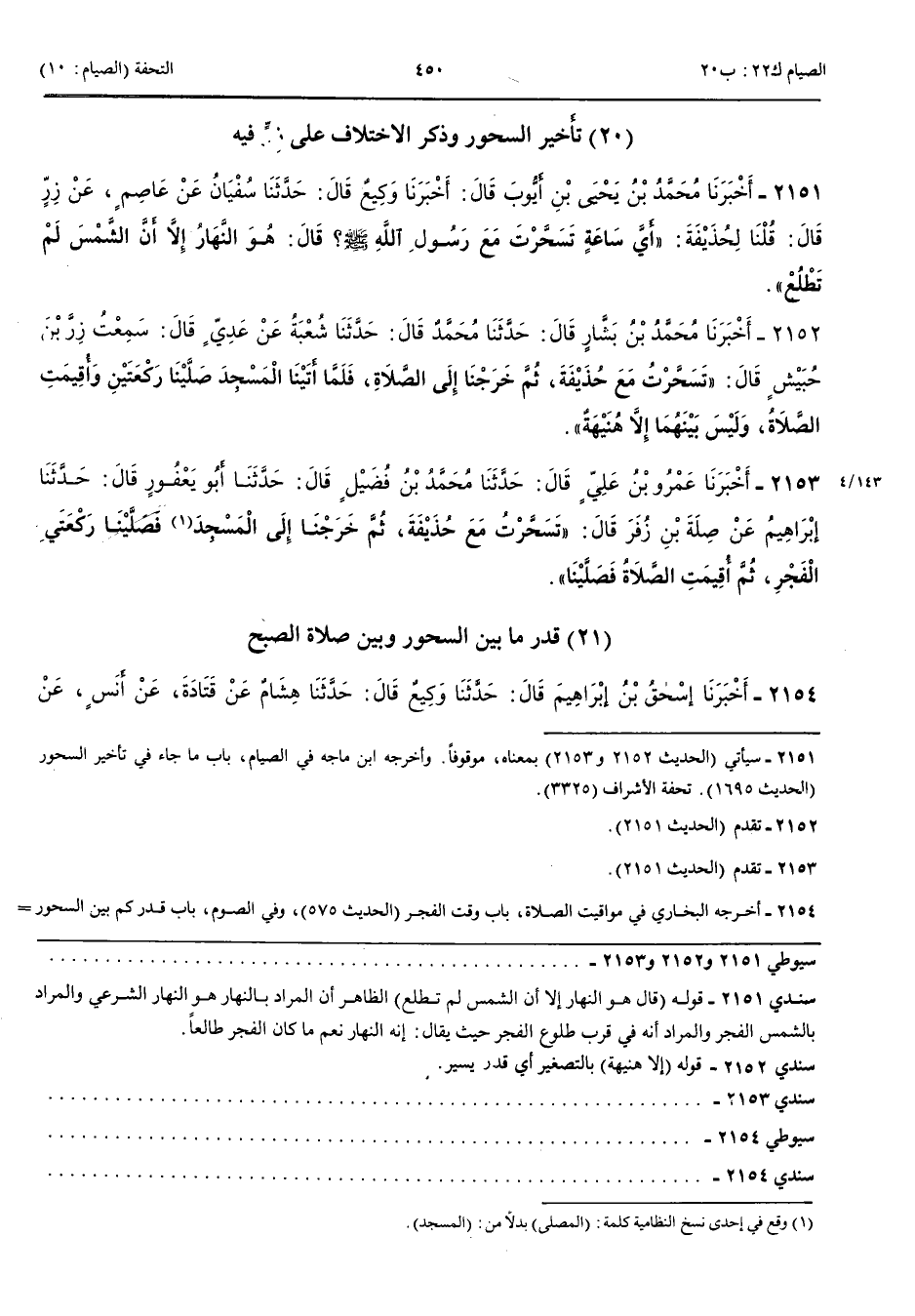 تَأْخِيرُ السُّحُورِ وَذِكْرُ الِاخْتِلَافِ عَلَى زِرٍّ فِيهِ 2151 - أَخْبَرَنَا مُحَمَّدُ بْنُ يَحْيَى بْنِ أَيُّوبَ قَالَ أَنْبَأَنَا وَكِيعٌ قَالَ حَدَّثَنَا سُفْيَانُ عَنْ عَاصِمٍ عَنْ زِرٍّ قَالَ قُلْنَا لِحُذَيْفَةَ أَيَّ سَاعَةٍ تَسَحَّرْتَ مَعَ رَسُولِ اللَّهِ صَلَّى اللَّهُ عَلَيْهِ وَسَلَّمَ قَالَ هُوَ النَّهَارُ إِلَّا أَنَّ الشَّمْسَ لَمْ تَطْلُعْ
