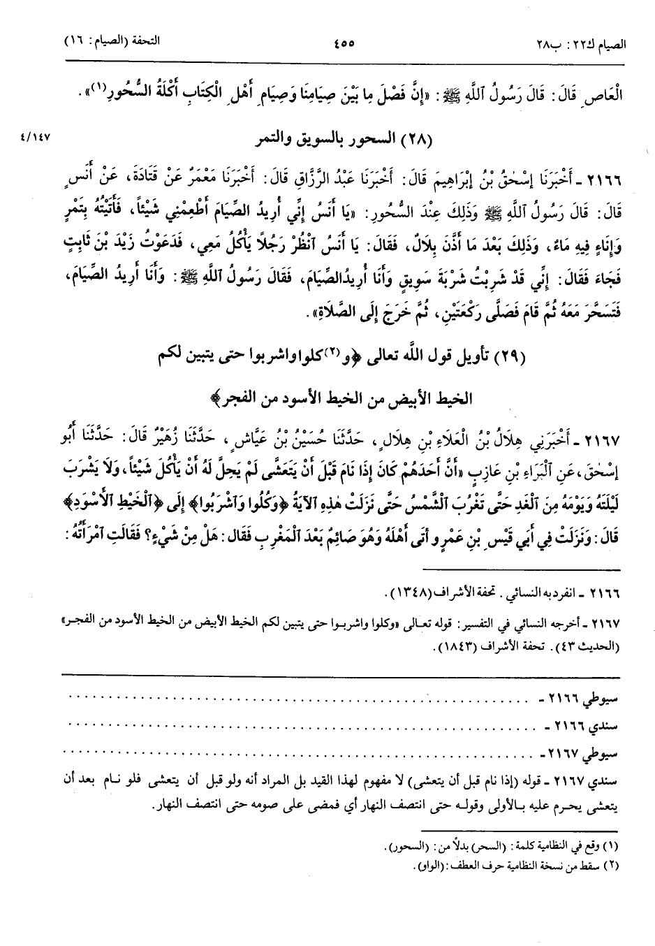 السَّحُورُ بِالسَّوِيقِ وَالتَّمْرِ 2166 - أَخْبَرَنَا إِسْحَقُ بْنُ إِبْرَاهِيمَ قَالَ أَنْبَأَنَا عَبْدُ الرَّزَّاقِ قَالَ أَنْبَأَنَا مَعْمَرٌ عَنْ قَتَادَةَ عَنْ أَنَسٍ قَالَ قَالَ رَسُولُ اللَّهِ صَلَّى اللَّهُ عَلَيْهِ وَسَلَّمَ وَذَلِكَ عِنْدَ السُّحُورِ يَا أَنَسُ إِنِّي أُرِيدُ الصِّيَامَ أَطْعِمْنِي شَيْئًا فَأَتَيْتُهُ بِتَمْرٍ وَإِنَاءٍ فِيهِ مَاءٌ وَذَلِكَ بَعْدَ مَا أَذَّنَ بِلَالٌ فَقَالَ يَا أَنَسُ انْظُرْ رَجُلًا يَأْكُلْ مَعِي فَدَعَوْتُ زَيْدَ بْنَ ثَابِتٍ فَجَاءَ فَقَالَ إِنِّي قَدْ شَرِبْتُ شَرْبَةَ سَوِيقٍ وَأَنَا أُرِيدُ الصِّيَامَ فَقَالَ رَسُولُ اللَّهِ صَلَّى اللَّهُ عَلَيْهِ وَسَلَّمَ وَأَنَا أُرِيدُ الصِّيَامَ فَتَسَحَّرَ مَعَهُ ثُمَّ قَامَ فَصَلَّى رَكْعَتَيْنِ ثُمَّ خَرَجَ إِلَى الصَّلَاةِ