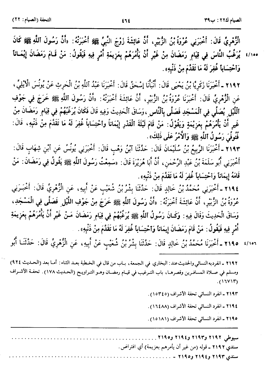2192 - أَخْبَرَنَا زَكَرِيَّا بْنُ يَحْيَى قَالَ أَنْبَأَنَا إِسْحَقُ قَالَ أَنْبَأَنَا عَبْدُ اللَّهِ بْنُ الْحَارِثِ عَنْ يُونُسَ الْأَيْلِيِّ عَنْ الزُّهْرِيِّ قَالَ أَخْبَرَنِي عُرْوَةُ بْنُ الزُّبَيْرِ أَنَّ عَائِشَةَ أَخْبَرَتْهُ أَنَّ رَسُولَ اللَّهِ صَلَّى اللَّهُ عَلَيْهِ وَسَلَّمَ خَرَجَ فِي جَوْفِ اللَّيْلِ يُصَلِّي فِي الْمَسْجِدِ فَصَلَّى بِالنَّاسِ وَسَاقَ الْحَدِيثَ وَفِيهِ قَالَتْ فَكَانَ يُرَغِّبُهُمْ فِي قِيَامِ رَمَضَانَ مِنْ غَيْرِ أَنْ يَأْمُرَهُمْ بِعَزِيمَةٍ وَيَقُولُ مَنْ قَامَ لَيْلَةَ الْقَدْرِ إِيمَانًا وَاحْتِسَابًا غُفِرَ لَهُ مَا تَقَدَّمَ مِنْ ذَنْبِهِ قَالَ فَتُوُفِّيَ رَسُولُ اللَّهِ صَلَّى اللَّهُ عَلَيْهِ وَسَلَّمَ وَالْأَمْرُ عَلَى ذَلِكَ