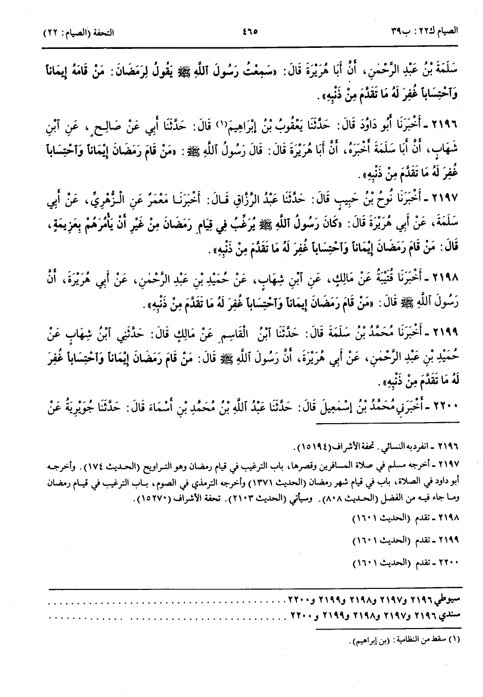 2200 - أَخْبَرَنِي مُحَمَّدُ بْنُ إِسْمَعِيلَ قَالَ حَدَّثَنَا عَبْدُ اللَّهِ بْنُ مُحَمَّدِ بْنِ أَسْمَاءَ قَالَ حَدَّثَنَا جُوَيْرِيَةُ عَنْ مَالِكٍ قَالَ الزُّهْرِيُّ أَخْبَرَنِي أَبُو سَلَمَةَ بْنُ عَبْدِ الرَّحْمَنِ وَحُمَيْدُ بْنُ عَبْدِ الرَّحْمَنِ عَنْ أَبِي هُرَيْرَةَ أَنَّ رَسُولَ اللَّهِ صَلَّى اللَّهُ عَلَيْهِ وَسَلَّمَ قَالَ مَنْ قَامَ رَمَضَانَ إِيمَانًا وَاحْتِسَابًا غُفِرَ لَهُ مَا تَقَدَّمَ مِنْ ذَنْبِهِ