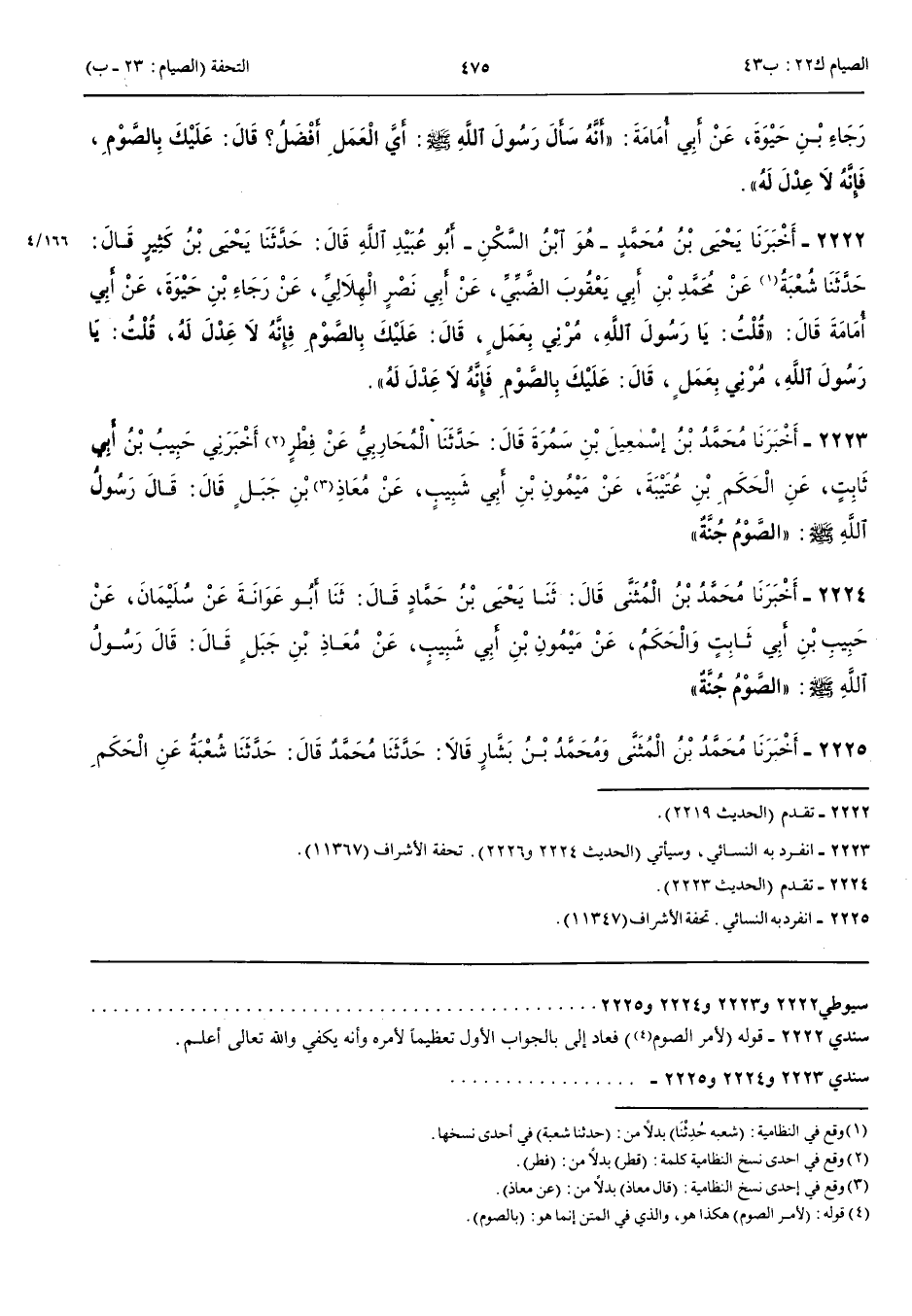 2222 - أَخْبَرَنَا يَحْيَى بْنُ مُحَمَّدٍ هُوَ ابْنُ السَّكَنِ أَبُو عُبَيْدِ اللَّهِ قَالَ حَدَّثَنَا يَحْيَى بْنُ كَثِيرٍ قَالَ حَدَّثَنَا شُعْبَةُ عَنْ مُحَمَّدِ بْنِ أَبِي يَعْقُوبَ الضَّبِّيِّ عَنْ أَبِي نَصْرٍ الْهِلَالِيِّ عَنْ رَجَاءِ بْنِ حَيْوَةَ عَنْ أَبِي أُمَامَةَ قَالَ قُلْتُ يَا رَسُولَ اللَّهِ مُرْنِي بِعَمَلٍ قَالَ عَلَيْكَ بِالصَّوْمِ فَإِنَّهُ لَا عَدْلَ لَهُ قُلْتُ يَا رَسُولَ اللَّهِ مُرْنِي بِعَمَلٍ قَالَ عَلَيْكَ بِالصَّوْمِ فَإِنَّهُ لَا عِدْلَ لَهُ