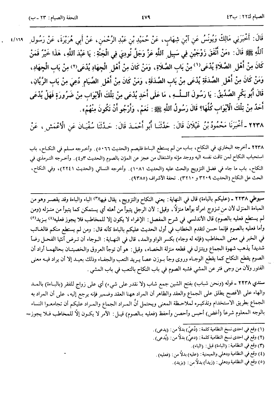 2238 - أَخْبَرَنَا مَحْمُودُ بْنُ غَيْلَانَ قَالَ حَدَّثَنَا أَبُو أَحْمَدَ قَالَ حَدَّثَنَا سُفْيَانُ عَنْ الْأَعْمَشِ عَنْ عُمَارَةَ بْنِ عُمَيْرٍ عَنْ عَبْدِ الرَّحْمَنِ بْنِ يَزِيدَ عَنْ عَبْدِ اللَّهِ قَالَ خَرَجْنَا مَعَ رَسُولِ اللَّهِ صَلَّى اللَّهُ عَلَيْهِ وَسَلَّمَ وَنَحْنُ شَبَابٌ لَا نَقْدِرُ عَلَى شَيْءٍ قَالَ يَا مَعْشَرَ الشَّبَابِ عَلَيْكُمْ بِالْبَاءَةِ فَإِنَّهُ أَغَضُّ لِلْبَصَرِ وَأَحْصَنُ لِلْفَرْجِ وَمَنْ لَمْ يَسْتَطِعْ فَعَلَيْهِ بِالصَّوْمِ فَإِنَّهُ لَهُ وِجَاءٌ