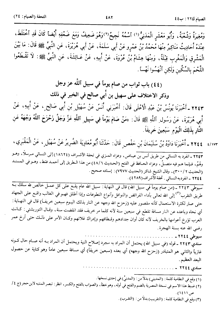 2244 - أَخْبَرَنَا دَاوُدُ بْنُ سُلَيْمَانَ بْنِ حَفْصٍ قَالَ حَدَّثَنَا أَبُو مُعَاوِيَةَ الضَّرِيرُ عَنْ سُهَيْلٍ عَنْ الْمَقْبُرِيِّ عَنْ أَبِي سَعِيدٍ الْخُدْرِيِّ قَالَ قَالَ رَسُولُ اللَّهِ صَلَّى اللَّهُ عَلَيْهِ وَسَلَّمَ مَنْ صَامَ يَوْمًا فِي سَبِيلِ اللَّهِ بَاعَدَ اللَّهُ بَيْنَهُ وَبَيْنَ النَّارِ بِذَلِكَ الْيَوْمِ سَبْعِينَ خَرِيفًا