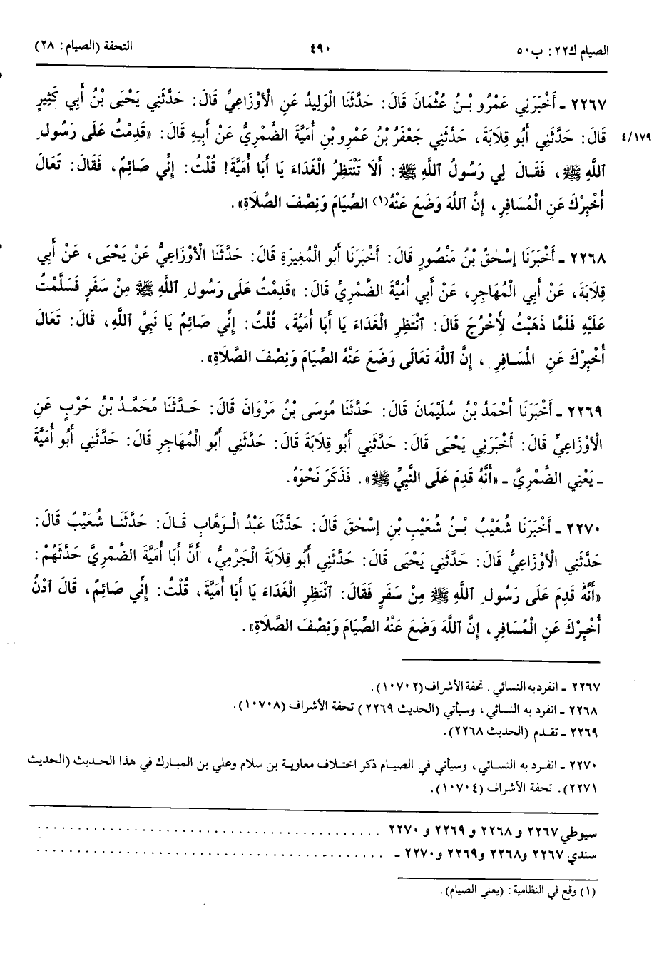 2268 - أَخْبَرَنَا إِسْحَقُ بْنُ مَنْصُورٍ قَالَ أَنْبَأَنَا أَبُو الْمُغِيرَةِ قَالَ حَدَّثَنَا الْأَوْزَاعِيُّ عَنْ يَحْيَى عَنْ أَبِي قِلَابَةَ عَنْ أَبِي الْمُهَاجِرِ عَنْ أَبِي أُمَيَّةَ الضَّمْرِيِّ قَالَ قَدِمْتُ عَلَى رَسُولِ اللَّهِ صَلَّى اللَّهُ عَلَيْهِ وَسَلَّمَ مِنْ سَفَرٍ فَسَلَّمْتُ عَلَيْهِ فَلَمَّا ذَهَبْتُ لِأَخْرُجَ قَالَ انْتَظِرْ الْغَدَاءَ يَا أَبَا أُمَيَّةَ قُلْتُ إِنِّي صَائِمٌ يَا نَبِيَّ اللَّهِ قَالَ تَعَالَ أُخْبِرْكَ عَنْ الْمُسَافِرِ إِنَّ اللَّهَ تَعَالَى وَضَعَ عَنْهُ الصِّيَامَ وَنِصْفَ الصَّلَاةِ 2269 - أَخْبَرَنَا أَحْمَدُ بْنُ سُلَيْمَانَ قَالَ حَدَّثَنَا مُوسَى بْنُ مَرْوَانَ قَالَ حَدَّثَنَا مُحَمَّدُ بْنُ حَرْبٍ عَنْ الْأَوْزَاعِيِّ قَالَ أَخْبَرَنِي يَحْيَى قَالَ حَدَّثَنِي أَبُو قِلَابَةَ قَالَ حَدَّثَنِي أَبُو الْمُهَاجِرِ قَالَ حَدَّثَنِي أَبُو أُمَيَّةَ يَعْنِي الضَّمْرِيَّ أَنَّهُ قَدِمَ عَلَى النَّبِيِّ صَلَّى اللَّهُ عَلَيْهِ وَسَلَّمَ فَذَكَرَ نَحْوَهُ