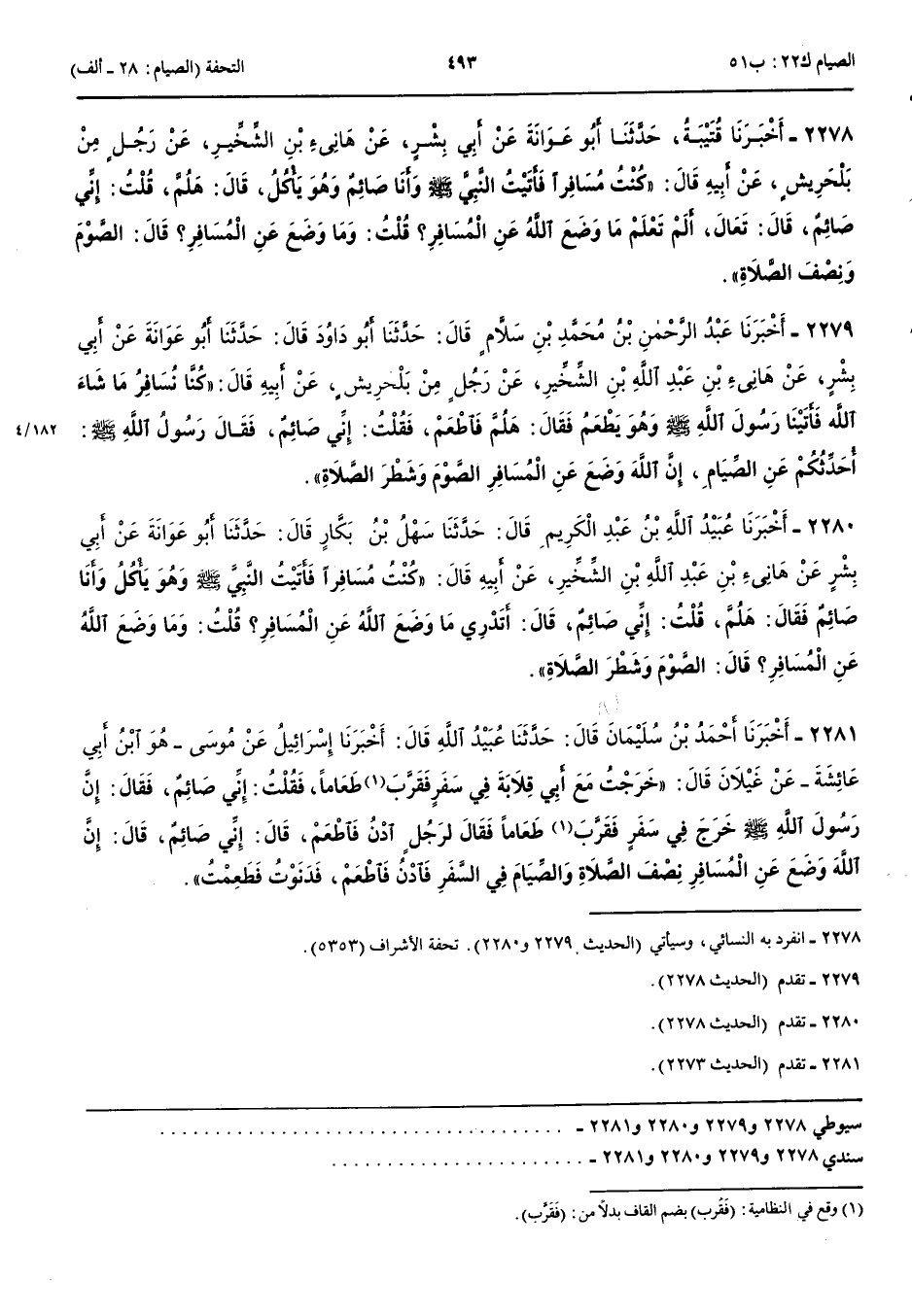 2278 - أَخْبَرَنَا قُتَيْبَةُ قَالَ حَدَّثَنَا أَبُو عَوَانَةَ عَنْ أَبِي بِشْرٍ عَنْ هَانِئِ بْنِ الشِّخِّيرِ عَنْ رَجُلٍ مِنْ بَلْحَرِيشٍ عَنْ أَبِيهِ قَالَ كُنْتُ مُسَافِرًا فَأَتَيْتُ النَّبِيَّ صَلَّى اللَّهُ عَلَيْهِ وَسَلَّمَ وَأَنَا صَائِمٌ وَهُوَ يَأْكُلُ قَالَ هَلُمَّ قُلْتُ إِنِّي صَائِمٌ قَالَ تَعَالَ أَلَمْ تَعْلَمْ مَا وَضَعَ اللَّهُ عَنْ الْمُسَافِرِ قُلْتُ وَمَا وَضَعَ عَنْ الْمُسَافِرِ قَالَ الصَّوْمَ وَنِصْفَ الصَّلَاةِ
