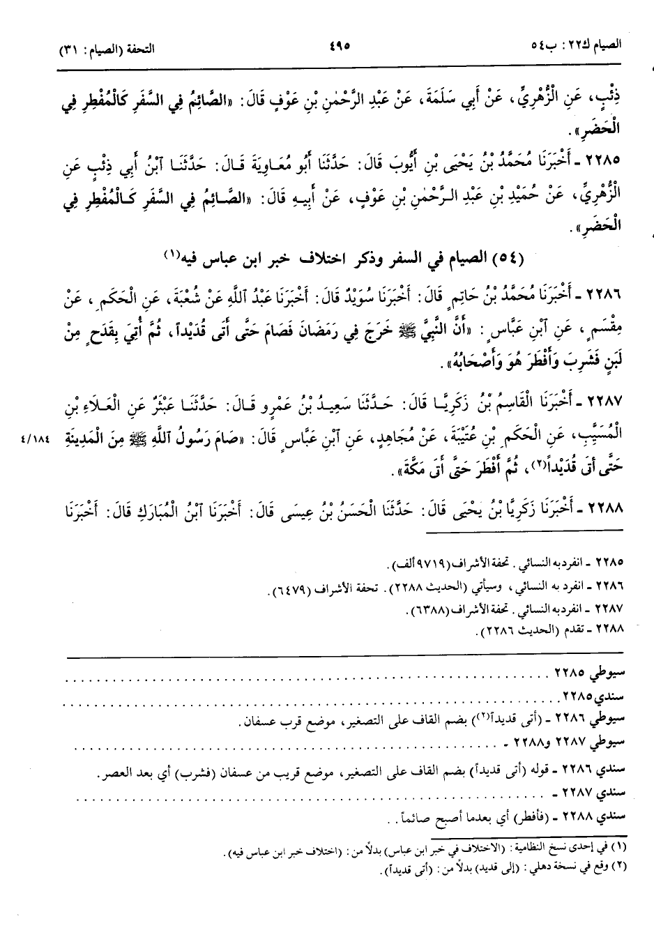 الصِّيَامُ فِي السَّفَرِ وَذِكْرُ اخْتِلَافِ خَبَرِ ابْنِ عَبَّاسٍ فِيهِ 2286 - أَخْبَرَنَا مُحَمَّدُ بْنُ حَاتِمٍ قَالَ أَنْبَأَنَا سُوَيْدٌ قَالَ أَخْبَرَنَا عَبْدُ اللَّهِ عَنْ شُعْبَةَ عَنْ الْحَكَمِ عَنْ مِقْسَمٍ عَنْ ابْنِ عَبَّاسٍ أَنَّ النَّبِيَّ صَلَّى اللَّهُ عَلَيْهِ وَسَلَّمَ خَرَجَ فِي رَمَضَانَ فَصَامَ حَتَّى أَتَى قُدَيْدًا ثُمَّ أُتِيَ بِقَدَحٍ مِنْ لَبَنٍ فَشَرِبَ وَأَفْطَرَ هُوَ وَأَصْحَابُهُ