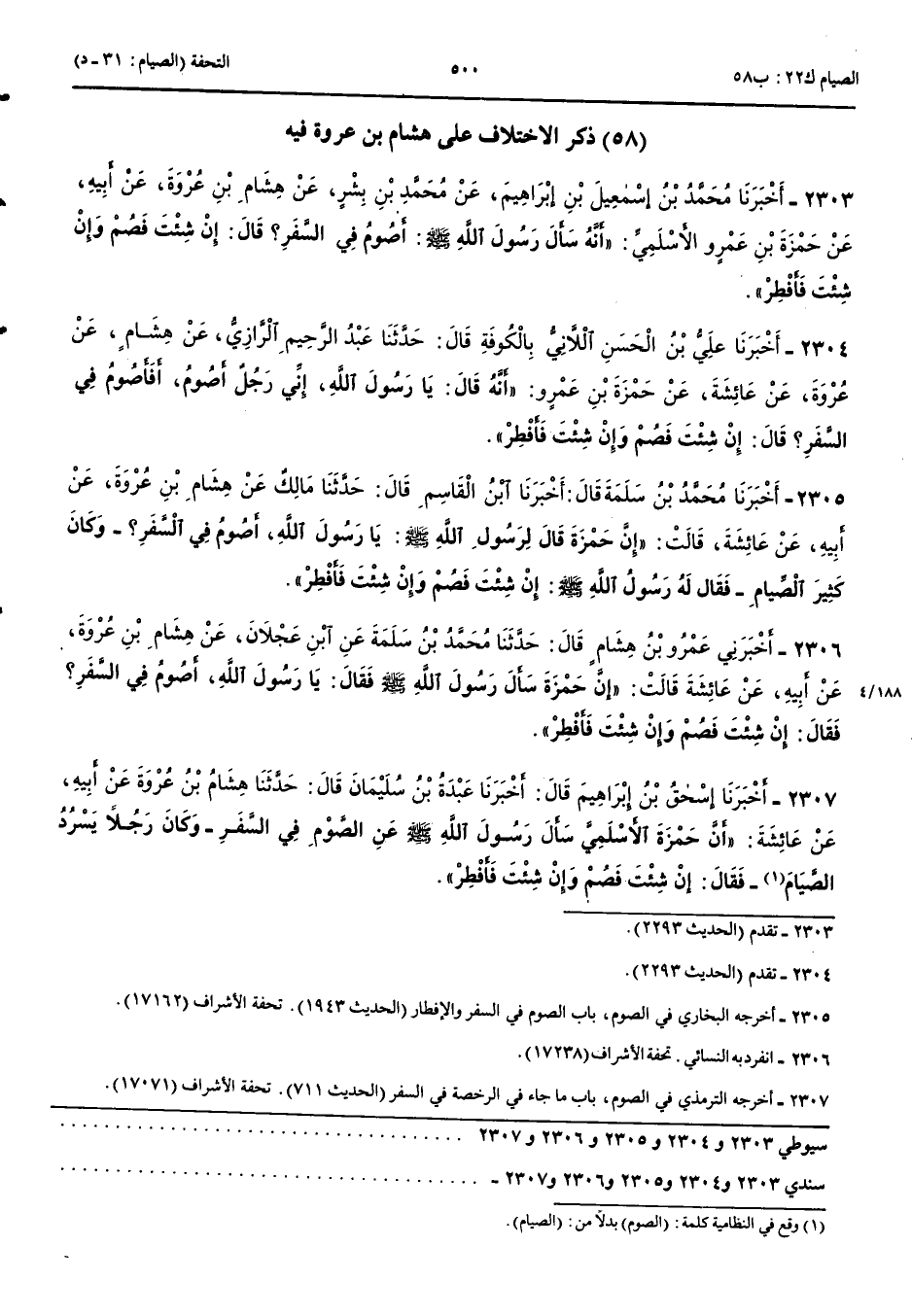 ذِكْرُ الِاخْتِلَافِ عَلَى هِشَامِ بْنِ عُرْوَةَ فِيهِ 2303 - أَخْبَرَنَا مُحَمَّدُ بْنُ إِسْمَعِيلَ بْنِ إِبْرَاهِيمَ عَنْ مُحَمَّدِ بْنِ بِشْرٍ عَنْ هِشَامِ بْنِ عُرْوَةَ عَنْ أَبِيهِ عَنْ حَمْزَةَ بْنِ عَمْرٍو الْأَسْلَمِيِّ أَنَّهُ سَأَلَ رَسُولَ اللَّهِ صَلَّى اللَّهُ عَلَيْهِ وَسَلَّمَ أَصُومُ فِي السَّفَرِ قَالَ إِنْ شِئْتَ فَصُمْ وَإِنْ شِئْتَ فَأَفْطِرْ