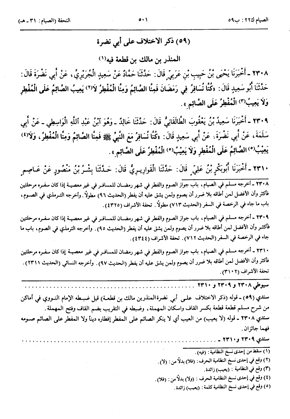 ذِكْرُ الِاخْتِلَافِ عَلَى أَبِي نَضْرَةَ الْمُنْذِرِ بْنِ مَالِكٍ بْنِ قُطَعَةَ فِيهِ 2308 - أَخْبَرَنَا يَحْيَى بْنُ حَبِيبِ بْنِ عَرَبِيٍّ قَالَ حَدَّثَنَا حَمَّادٌ عَنْ سَعِيدٍ الْجُرَيْرِيِّ عَنْ أَبِي نَضْرَةَ قَالَ حَدَّثَنَا أَبُو سَعِيدٍ قَالَ كُنَّا نُسَافِرُ فِي رَمَضَانَ فَمِنَّا الصَّائِمُ وَمِنَّا الْمُفْطِرُ لَا يَعِيبُ الصَّائِمُ عَلَى الْمُفْطِرِ وَلَا يَعِيبُ الْمُفْطِرُ عَلَى الصَّائِمِ
