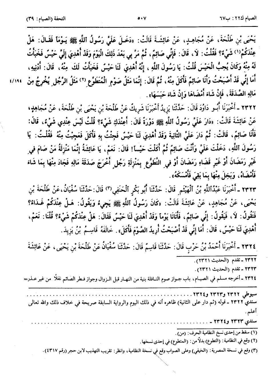 2322 - أَخْبَرَنَا أَبُو دَاوُدَ قَالَ حَدَّثَنَا يَزِيدُ أَنْبَأَنَا شَرِيكٌ عَنْ طَلْحَةَ بْنِ يَحْيَى بْنِ طَلْحَةَ عَنْ مُجَاهِدٍ عَنْ عَائِشَةَ قَالَتْ دَارَ عَلَيَّ رَسُولُ اللَّهِ صَلَّى اللَّهُ عَلَيْهِ وَسَلَّمَ دَوْرَةً قَالَ أَعِنْدَكِ شَيْءٌ قَالَتْ لَيْسَ عِنْدِي شَيْءٌ قَالَ فَأَنَا صَائِمٌ قَالَتْ ثُمَّ دَارَ عَلَيَّ الثَّانِيَةَ وَقَدْ أُهْدِيَ لَنَا حَيْسٌ فَجِئْتُ بِهِ فَأَكَلَ فَعَجِبْتُ مِنْهُ فَقُلْتُ يَا رَسُولَ اللَّهِ دَخَلْتَ عَلَيَّ وَأَنْتَ صَائِمٌ ثُمَّ أَكَلْتَ حَيْسًا قَالَ نَعَمْ يَا عَائِشَةُ إِنَّمَا مَنْزِلَةُ مَنْ صَامَ فِي غَيْرِ رَمَضَانَ أَوْ غَيْرِ قَضَاءِ رَمَضَانَ أَوْ فِي التَّطَوُّعِ بِمَنْزِلَةِ رَجُلٍ أَخْرَجَ صَدَقَةَ مَالِهِ فَجَادَ مِنْهَا بِمَا شَاءَ فَأَمْضَاهُ وَبَخِلَ مِنْهَا بِمَا بَقِيَ فَأَمْسَكَهُ