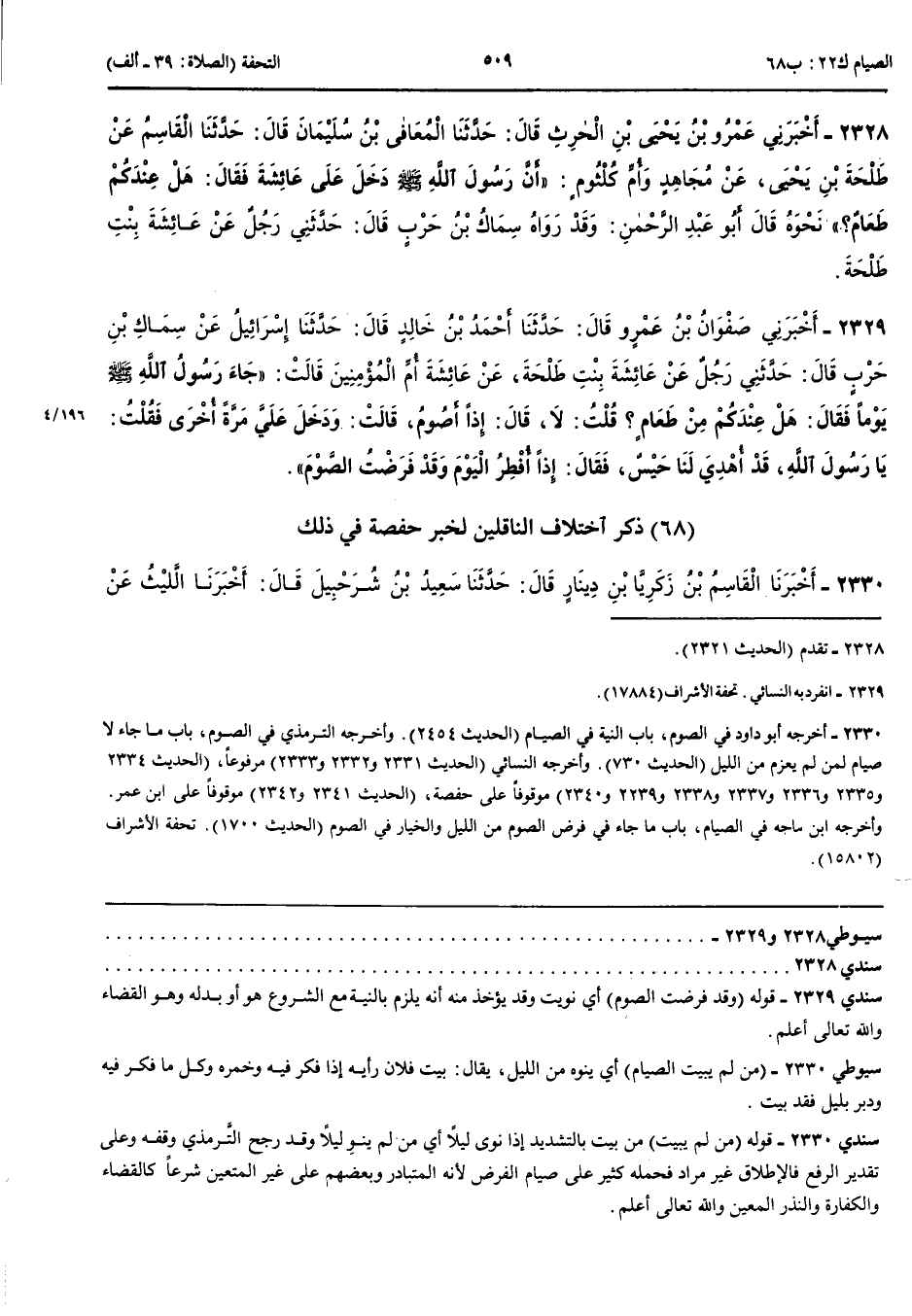 2329 - أَخْبَرَنِي صَفْوَانُ بْنُ عَمْرٍو قَالَ حَدَّثَنَا أَحْمَدُ بْنُ خَالِدٍ قَالَ حَدَّثَنَا إِسْرَائِيلُ عَنْ سِمَاكِ بْنِ حَرْبٍ قَالَ حَدَّثَنِي رَجُلٌ عَنْ عَائِشَةَ بِنْتِ طَلْحَةَ عَنْ عَائِشَةَ أُمِّ الْمُؤْمِنِينَ قَالَتْ جَاءَ رَسُولُ اللَّهِ صَلَّى اللَّهُ عَلَيْهِ وَسَلَّمَ يَوْمًا فَقَالَ هَلْ عِنْدَكُمْ مِنْ طَعَامٍ قُلْتُ لَا قَالَ إِذًا أَصُومُ قَالَتْ وَدَخَلَ عَلَيَّ مَرَّةً أُخْرَى فَقُلْتُ يَا رَسُولَ اللَّهِ قَدْ أُهْدِيَ لَنَا حَيْسٌ فَقَالَ إِذًا أُفْطِرُ الْيَوْمَ وَقَدْ فَرَضْتُ الصَّوْمَ