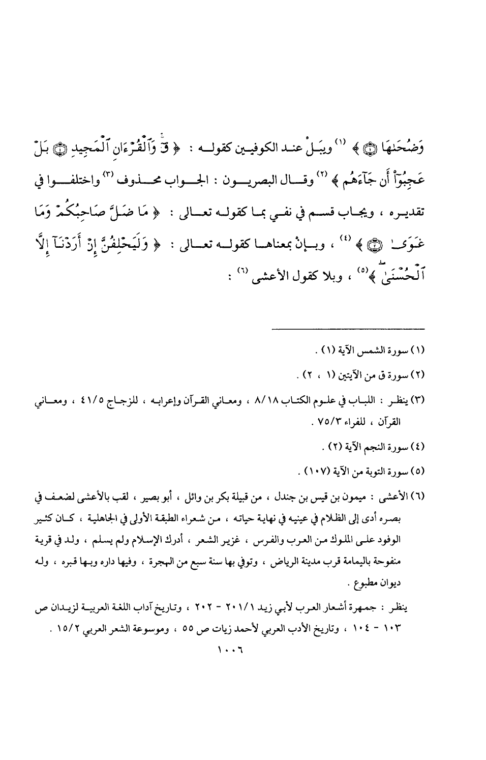 (¬6) الأعشى: ميمون بن قيس بن جندل، من قبيلة بكر بن وائل، أبو بصير، لقب بالأعشى لضعف في بصره أدى إلى الظلام في عينيه في نهاية حياته، من شعراء الطبقة الأولى في الجاهلية، كان كثير الوفود على الملوك من العرب والفرس، غزير الشعر، أدرك الإسلام ولم يسلم، ولد في قرية منفوحة باليمامة قرب مدينة الرياض، وتوفي بها سنة سبع من الهجرة، وفيها داره وبها قبره، وله ديوان مطبوع.