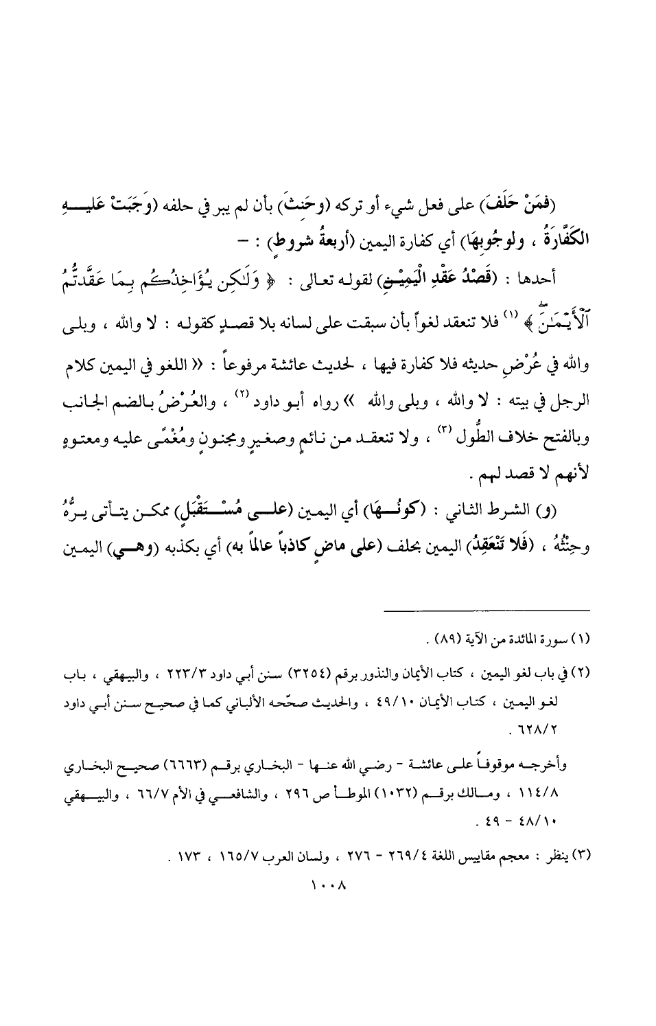 (¬2) في باب لغو اليمين، كتاب الأيمان والنذور برقم (3254) سنن أبي داود 3/ 223، والبيهقي، باب لغو اليمين، كتاب الأيمان 10/ 49، والحديث صحّحه الألباني كما في صحيح سنن أبي داود 2/ 628.