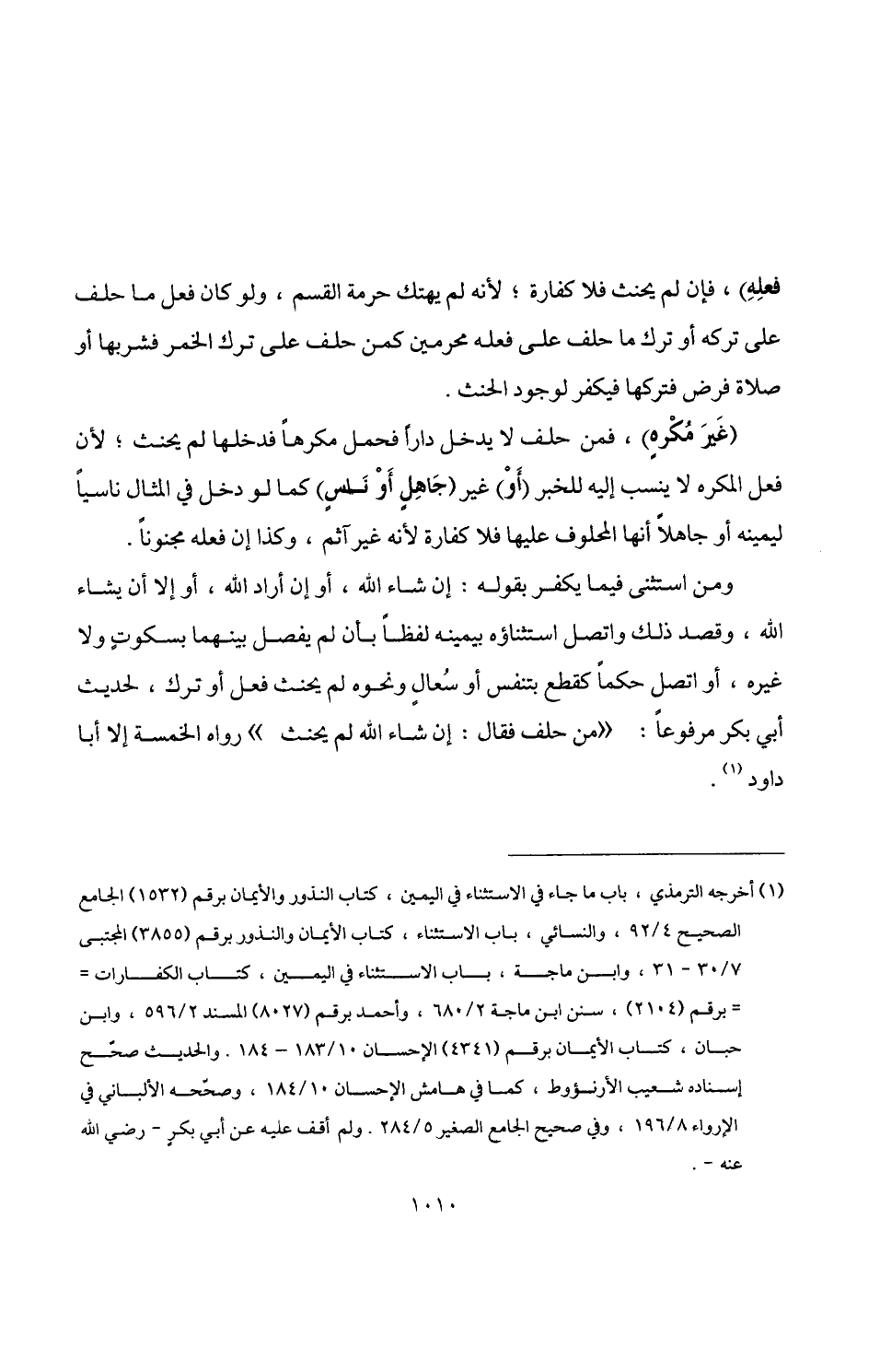 (¬1) أخرجه الترمذي، باب ما جاء في الاستثناء في اليمين، كتاب النذور والأيمان برقم (1532) الجامع الصحيح 4/ 92، والنسائي، باب الاستثناء، كتاب الأيمان والنذور برقم (3855) المجتبى 7/ 30 - 31، وابن ماجة، باب الاستثناء في اليمين، كتاب الكفارات برقم (2104)، سنن ابن ماجة 2/ 680، وأحمد برقم (8027) المسند 2/ 596، وابن حبان، كتاب الأيمان برقم (4341) الإحسان 10/ 184 - 184. والحديث صحّح إسناده شعيب الأرنؤوط، كما في هامش الإحسان 10/ 184، وصحّحه الألبانى في الإرواء 8/ 196، وفي صحيح الجامع الصغير 5/ 284. ولم أقف عليه عن أبي بكرٍ -رضي اللَّه عنه-.