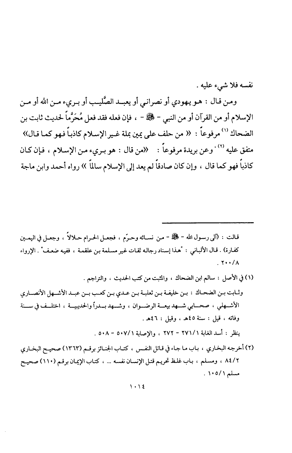 ومن قال: هو يهودي أو نصراني أو يعبد الصَّليب أو بريء من اللَّه أو من الإسلام أو من القرآن أو من النبي -صلى اللَّه عليه وسلم-، فإن فعله فقد فعل مُحَرَّمًا لحديث ثابت بن الضحاك (¬1) مرفوعًا: "من حلف على يمين بملة غير الإسلام كاذبًا فهو كما قال" متفق عليه (¬2)، وعن بريدة مرفوعًا: "من قال: هو بريء من الإسلام، فإن كان كاذبًا فهو كما قال، وإن كان صادقًا لم يعد إلى الإسلام سالمًا" رواه أحمد