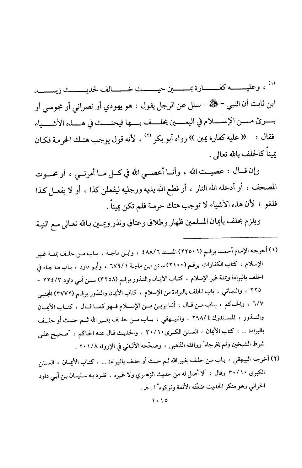 (¬2) أخرجه البيهقي، باب من حلف بغير اللَّه ثم حنث أو حلف بالبراءة. . .، كتاب الأيمان، السنن الكبرى 10/ 30 وقال: "لا أصل له من حديث الزهري ولا غيره، تفرد به سليمان بن أبي داود الحراني وهو منكر الحديث ضعّفه الأئمة وتركوه" ا. هـ.