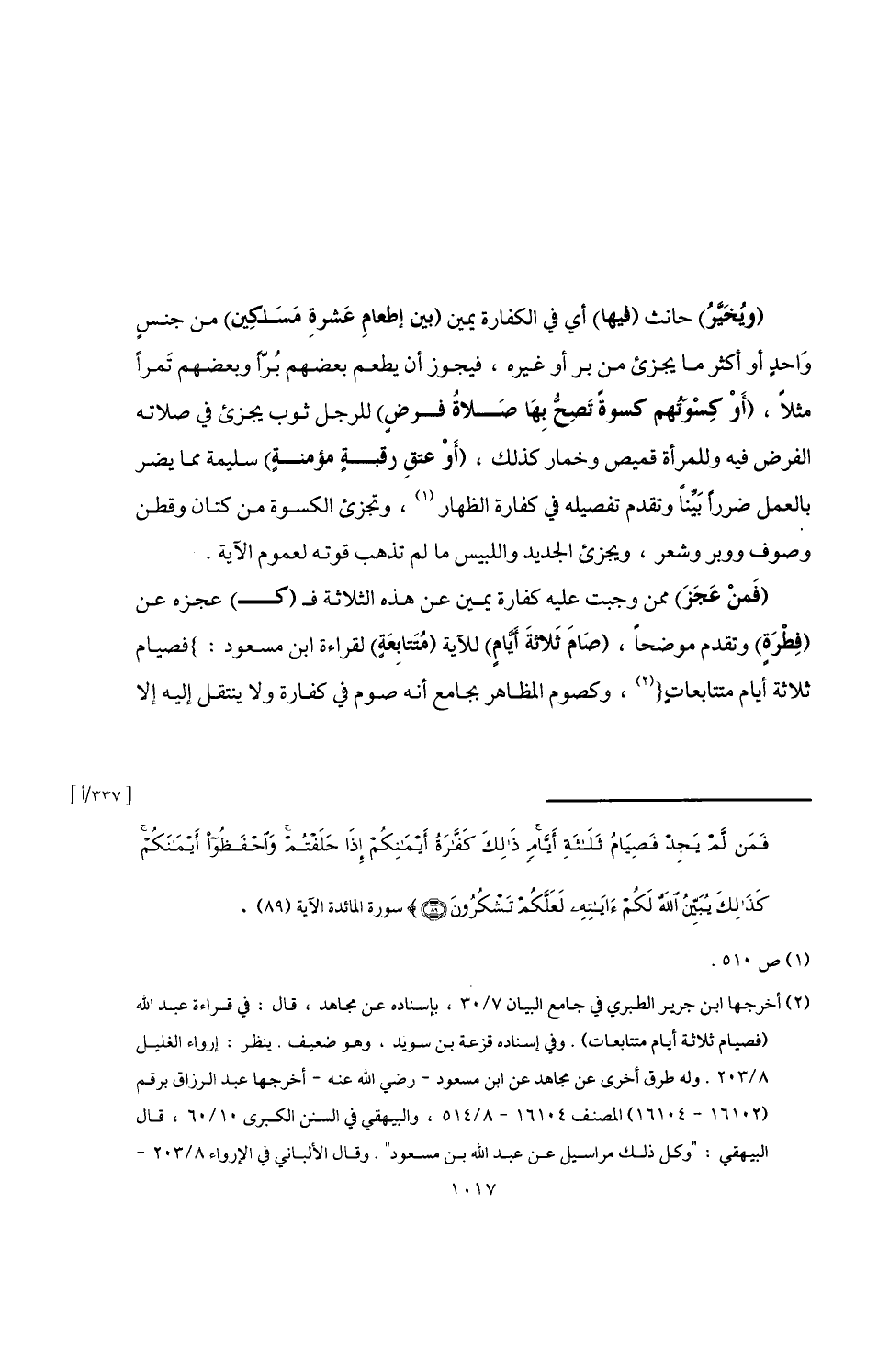 (ويُخَيَّرُ) حانث (فيها) أي في الكفارة يمين (بين إطعامِ عَشرةِ مَسَاكِين) من جنسٍ وَاحدٍ أو أكثر ما يجزئ من بر أو غيره، فيجوز أن يطعم بعضهم بُرًّا وبعضهم تَمرًا مثلًا، (أَوْ كِسْوَتُهم كسوةً تَصِحُّ بِها صَلاةُ فرضٍ) للرجل ثوب يجزئ في صلاته الفرض فيه وللمرأة قميص وخمار كذلك، (أَوْ عتقِ رقبةٍ مؤمنةٍ) سليمة مما يضر بالعمل ضررًا بَيِّنًا وتقدم تفصيله في كفارة الظهار (¬1)، وتجزئ الكسوة من كتان وقطن وصوف ووبر وشعر، ويجزئ الجديد واللبيس ما لم تذهب قوته لعموم الآية.