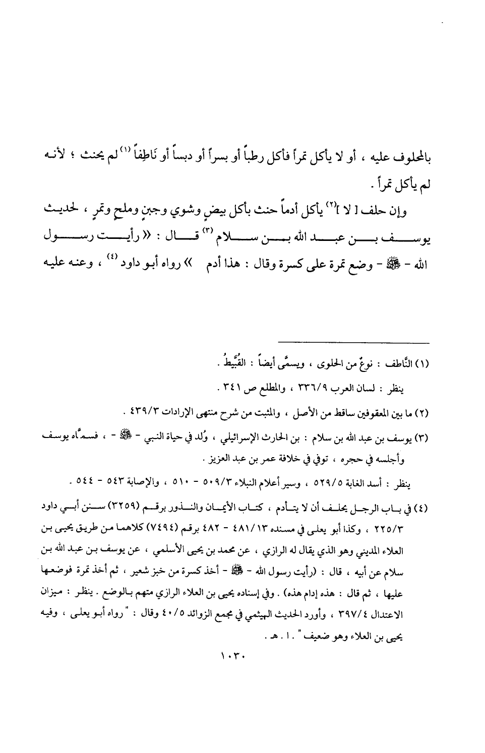 (¬4) في باب الرجل يحلف أن لا يتأدم، كتاب الأيمان والنذور برقم (3259) سنن أبي داود 3/ 225، وكذا أبو يعلى في مسنده 13/ 481 - 482 برقم (7494) كلاهما من طريق يحيى بن العلاء المديني وهو الذي يقال له الرازي، عن محمد بن يحيى الأسلمي، عن يوسف بن عبد اللَّه بن سلام عن أبيه، قال: (رأيت رسول اللَّه -صلى اللَّه عليه وسلم- أخذ كسرة من خبز شعير، ثم أخذ تمرة فوضعها عليها، ثم قال: هذه إدام هذه). وفي إسناده يحيى بن العلاء الرازي متهم بالوضع. ينظر: ميزان الاعتدال 4/ 397، وأورد الحديث الهيثمي في مجمع الزوائد 5/ 40 وقال: بها رواه أبو يعلى، وفيه يحيى بن العلاء وهو ضعيف". ا. هـ.