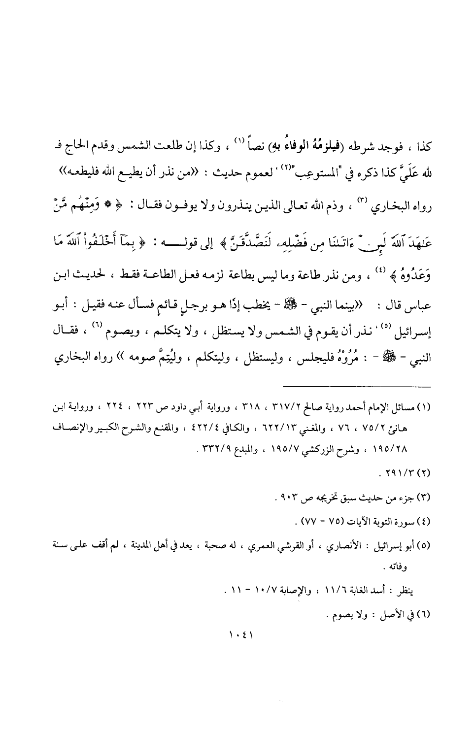 كذا، فوجد شرطه (فيلزمُهُ الوفاءُ بهِ) نصًّا (¬1)، وكذا إن طلعت الشمس وقدم الحاج فـ للَّه عَلَيَّ كذا ذكره في "المستوعِب" (¬2)، لعموم حديث: "من نذر أن يطيع اللَّه فليطعه" رواه البخاري (¬3)، وذم اللَّه تعالى الذين ينذرون ولا يوفون فقال: {وَمِنْهُمْ مَنْ عَاهَدَ اللَّهَ لَئِنْ آتَانَا مِنْ فَضْلِهِ لَنَصَّدَّقَنَّ} إلى قوله: {بِمَا أَخْلَفُوا اللَّهَ مَا وَعَدُوهُ} (¬4)، ومن نذر طاعة وما ليس بطاعة لزمه فعل الطاعة فقط، لحديث ابن عباس قال: "بينما النبي -صلى اللَّه عليه وسلم- يخطب إذَا هو برجلٍ قائم فسأل عنه فقيل: أبو إسرائيل (¬5)، نذر أن يقوم في الشمس ولا يستظل، ولا يتكلم، ويصوم (¬6)، فقال النبي -صلى اللَّه عليه وسلم-: مُرُوْهُ فليجلس، وليستظل، وليتكلم،