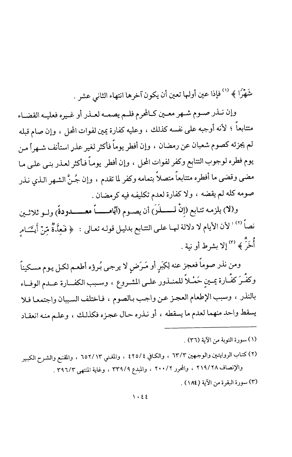 و(لا) يلزمه تتابع (إِنْ نَذَرَ) أن يصوم (إيَّامًا معدودةً) ولو ثلاثين نصًّا (¬2)؛ لأن الأيام لا دلالة لها على التتابع بدليل قوله تعالى: {فَعِدَّةٌ مِنْ أَيَّامٍ أُخَرَ} (¬3) إلا بشرط أو نية.