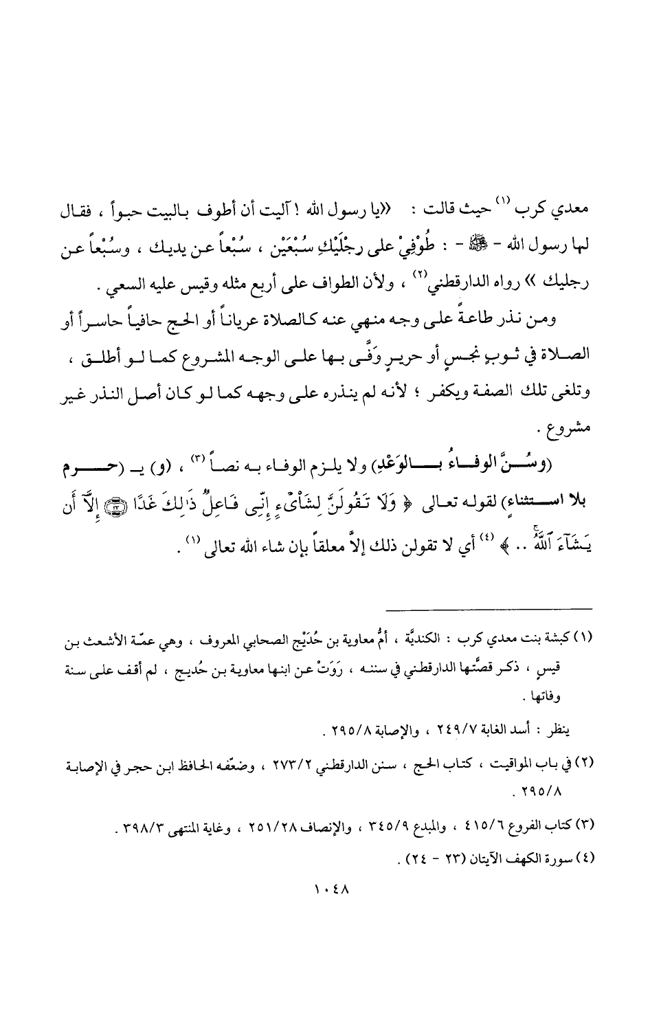 (وسُنَّ الوفاءُ بالوَعْدِ) ولا يلزم الوفاء به نصًّا (¬3)، (و) يـ (حرم بلا استثناءٍ) لقوله تعالى {وَلَا تَقُولَنَّ لِشَيْءٍ إِنِّي فَاعِلٌ ذَلِكَ غَدًا (23) إِلَّا أَنْ يَشَاءَ اللَّهُ. .} (¬4) أي لا تقولن ذلك إلا معلقًا بإن شاء اللَّه تعالى (¬5).