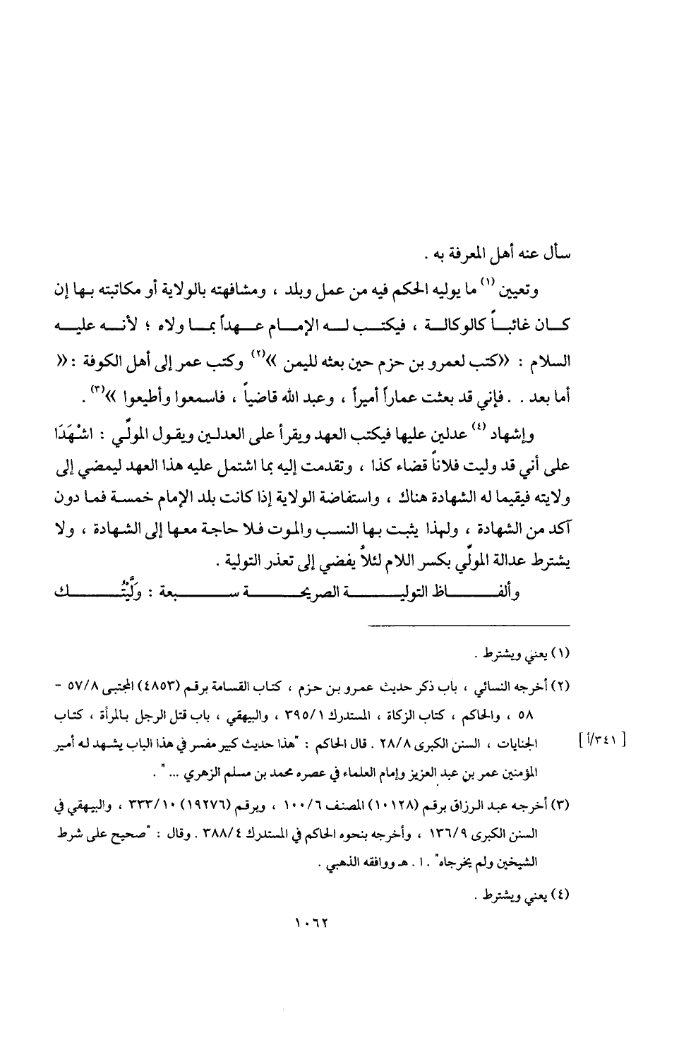 (¬2) أخرجه النسائي، باب ذكر حديث عمرو بن حزم، كتاب القسامة برقم (4853) المجتبى 8/ 57 - 58، والحاكم، كتاب الزكاة، المستدرك 1/ 395، والبيهقي، باب قتل الرجل بالمرأة, كتاب الجنايات، السنن الكبرى 8/ 28. قال الحاكم: "هذا حديث كبير مفسر في هذا الباب يشهد له أمير المؤمنين عمر بن عبد العزيز وإمام العلماء في عصره محمد بن مسلم الزهري. . . ".