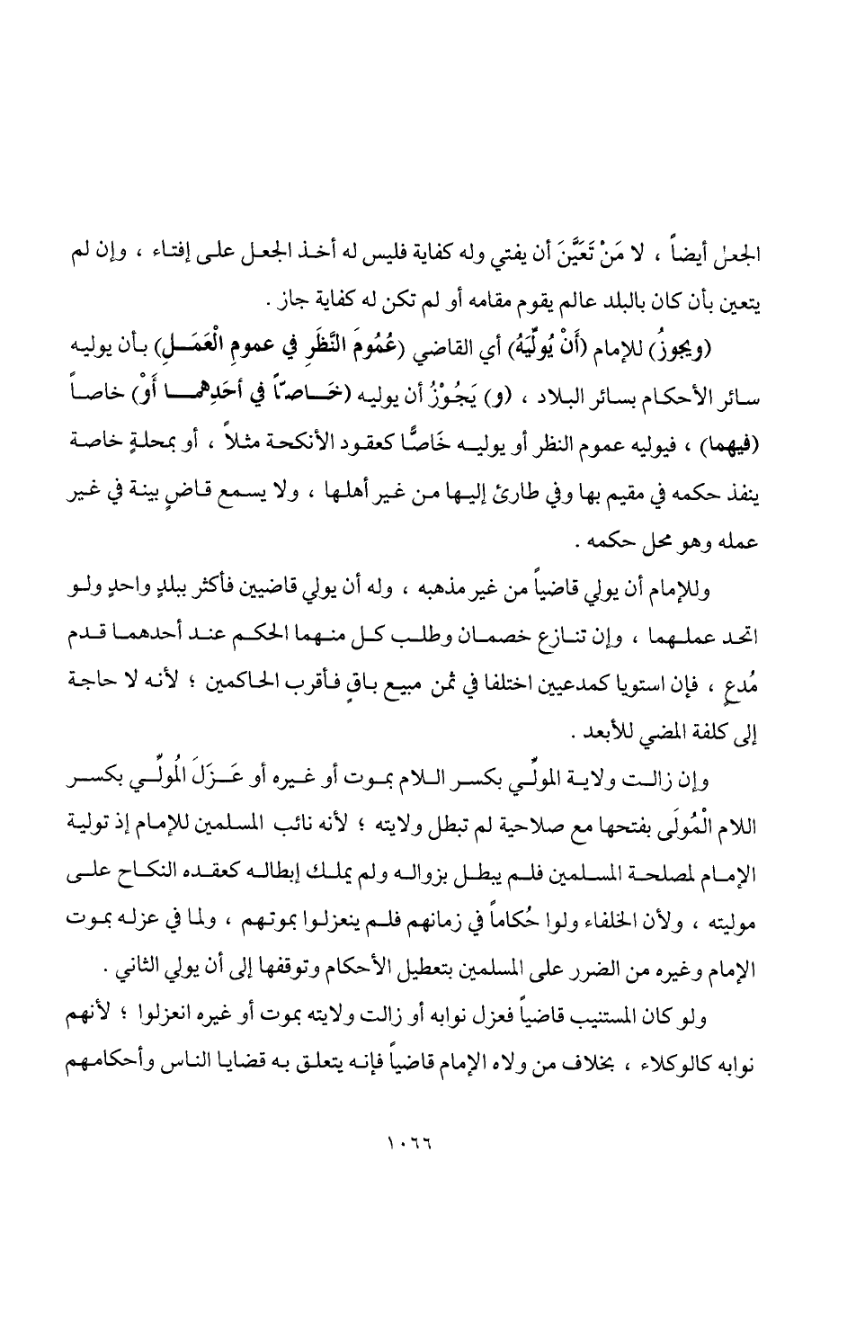 (ويجوزُ) للإمام (أَنْ يُولِّيَهُ) أي القاضي (عُمُومَ النَّظَرِ في عمومِ الْعَمَلِ) بأن يوليه سائر الأحكام بسائر البلاد، (و) يَجُوْزُ أن يوليه (خَاصًّا في أحَدِهما أَوْ) خاصًا (فيهما)، فيوليه عموم النظر أو يوليه خَاصًّا كعقود الأنكحة مثلًا، أو بمحلةٍ خاصة ينفذ حكمه في مقيم بها وفي طارئ إليها من غير أهلها، ولا يسمع قاضٍ بينة في غير عمله وهو محل حكمه.