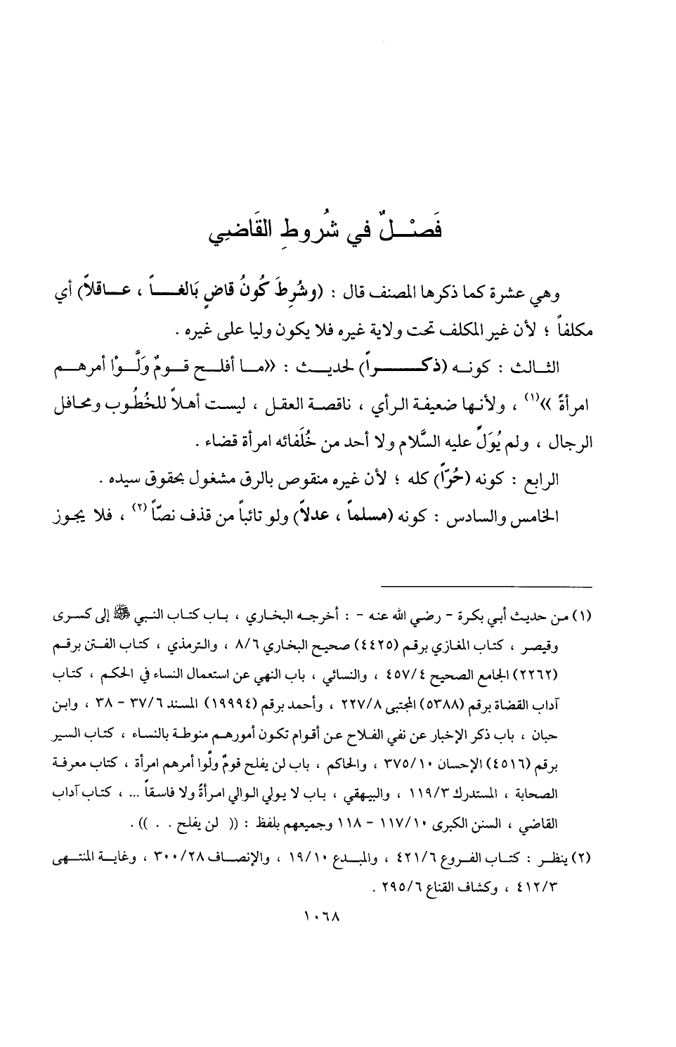 الثالث: كونه (ذكرًا) لحديث: "ما أفلح قومٌ وَلَّوْا أمرهم امرأةً" (¬1)، ولأنها ضعيفة الرأي، ناقصة العقل، ليست أهلًا للخُطُوب ومحافل الرجال، ولم يُوَلِّ عليه السَّلام ولا أحد من خُلَفائه امرأة قضاء.