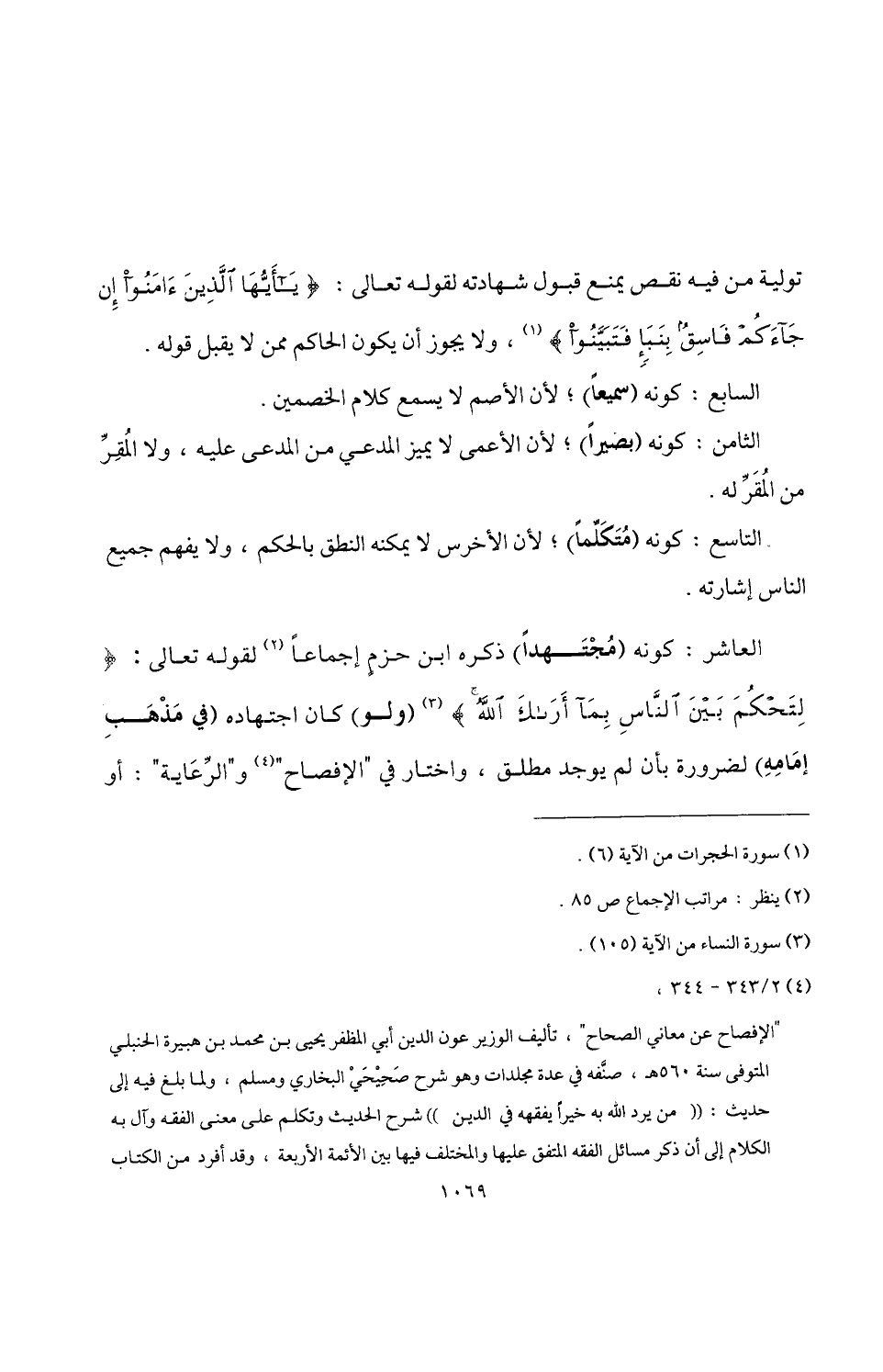 العاشر: كونه (مُجْتَهدًا) ذكرره ابن حزمٍ إجماعًا (¬2) لقوله تعالى: {لِتَحْكُمَ بَيْنَ النَّاسِ بِمَا أَرَاكَ اللَّهُ} (¬3) (ولو) كان اجتهاده (في مَذْهَبِ إمَامِهِ) لضرورة بأن لم يوجد مطلق، واختار في "الإفصاح" (¬4) و"الرِّعَاية": أو
