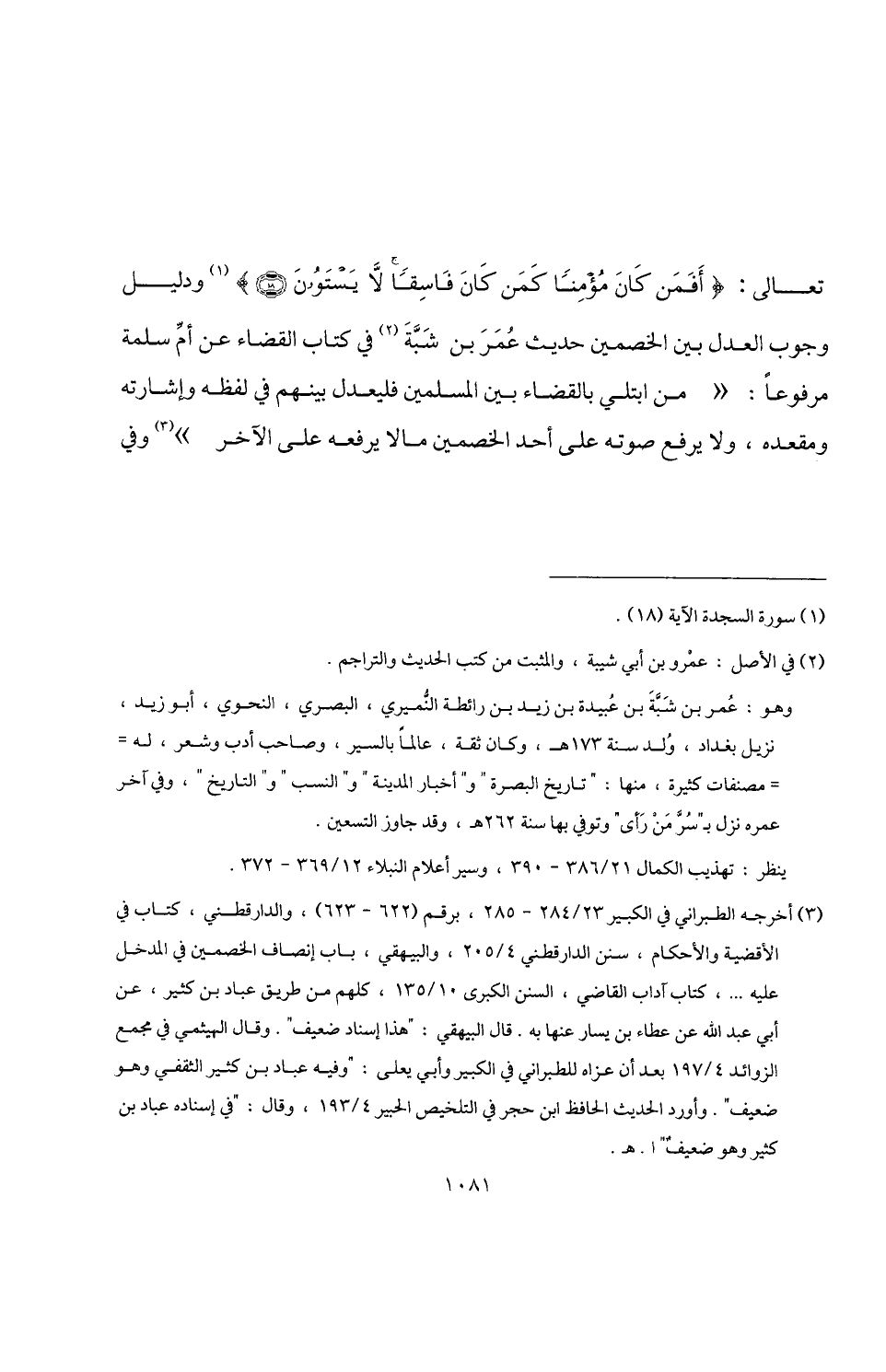 تعالى: {أَفَمَنْ كَانَ مُؤْمِنًا كَمَنْ كَانَ فَاسِقًا لَا يَسْتَوُونَ (18)} (¬1) ودليل وجوب العدل بين الخصمين حديث عُمَرَ بن شَبَّةَ (¬2) في كتاب القضاء عن أمِّ سلمة مرفوعًا: "من ابتلي بالقضاء بين السلمين فليعدل بينهم في لفظه وإشارته ومقعده، ولا يرفع صوته على أحد الخصمين ما لا يرفعه على الآخر" (¬3) وفي