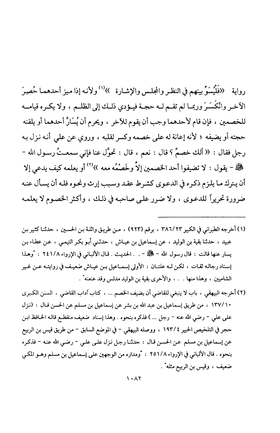 (¬2) أخرجه البيهقي، باب لا ينبغي للقاضي أن يضيف الخصم. . .، كتاب آداب القاضي، السنن الكبرى 10/ 137، من طريق إسماعيل بن عبد اللَّه بن بشر عن إسماعيل بن مسلم عن الحسن قال: (نزل على علي -رضي اللَّه عنه- رجل. . .) فذكره بنحوه. وهذا إسناد ضعيف منقطع قاله الحافظ ابن حجر في التلخيص الحبير 4/ 193، ووصله البيهقي -في الموضع السابق- من طريق قيس بن الربيع عن إسماعيل بن مسلم عن الحسن قال: حدثنا رجل نزل على علي -رضي اللَّه عنه- فذكره بنحوه. قال الألباني في الإرواء 8/ 251: "ومداره من الوجهين على إسماعيل بن مسلم وهو المكي ضعيف، وقيس بن الربيع مثله".