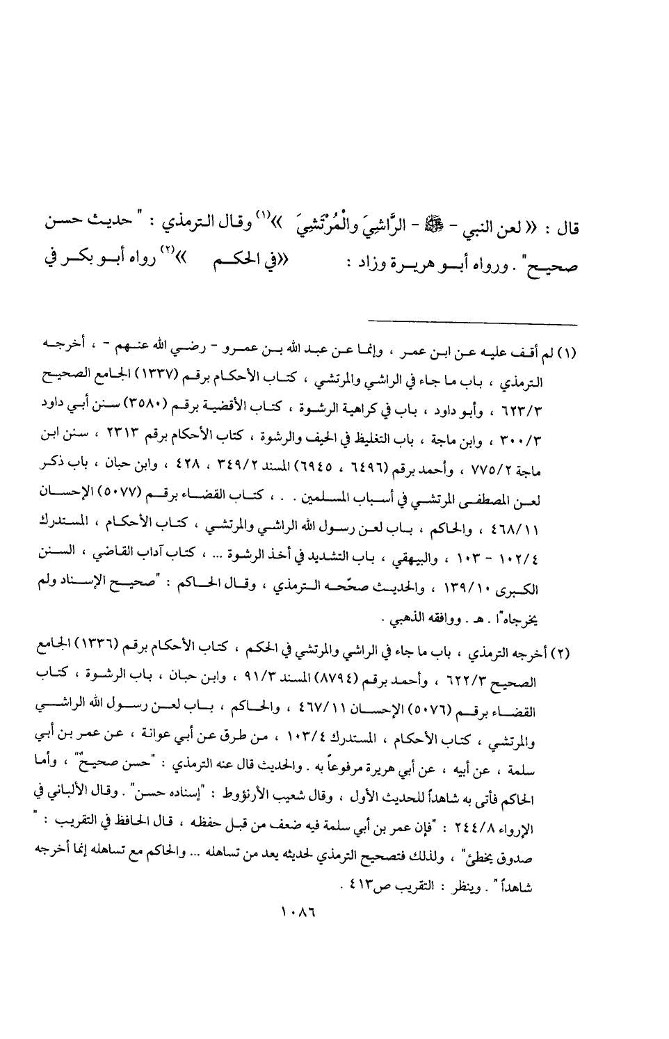 (¬2) أخرجه الترمذي، باب ما جاء في الراشي والمرتشي في الحكم، كتاب الأحكام برقم (1336) الجامع الصحيح 3/ 622، وأحمد برقم (8794) المسند 3/ 91، وابن حبان، باب الرشوة، كتاب القضاء برقم (5076) الإحسان 11/ 467، والحاكم، باب لعن رسول اللَّه الراشي والمرتشي، كتاب الأحكام، المستدرك 4/ 103، من طرق عن أبي عوانة، عن عمر بن أبي سلمة، عن أبيه، عن أبي هريرة مرفوعًا به. والحديث قال عنه الترمذي: "حسن صحيح"، وأما الحاكم فأتى به شاهدًا للحديث الأول، وقال شعيب الأرنؤوط: "إسناده حسن". وقال الألباني في الإرواء 8/ 244: "فإن عمر بن أبي سلمة فيه ضعف من قبل حفظه، قال الحافظ في التقريب: "صدوق يخطئ"، ولذلك فتصحيح الترمذي لحديثه يعد من تساهله. . . والحاكم مع تساهله إنما أخرجه شاهدًا". وينظر: التقريب ص 413.
