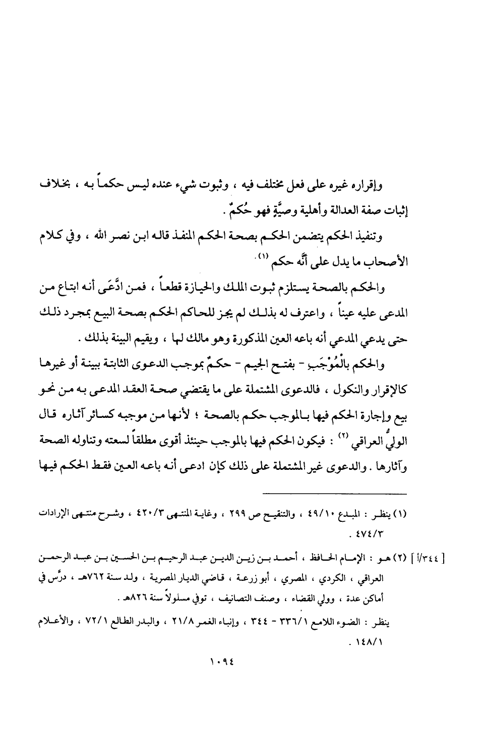والحكم بالمُوْجب -بفتح الجيم- حكمٌ بموجب الدعوى الثابتة ببينة أو غيرها كالإقرار والنكول، فالدعوى المشتملة على ما يقتضي صحة العقد المدعى به من نحو بيع وإجارة الحكم فيها بالموجب حكم بالصحة؛ لأنها من موجبه كسائر آثاره قال الوليُّ العراقي (¬2): فيكون الحكم فيها بالموجب حينئذ أقوى مطلقًا لسعته وتناوله الصحة وآثارها. والدعوى غير المشتملة على ذلك كإن أدعى أنه باعه العين فقط الحكم فيها