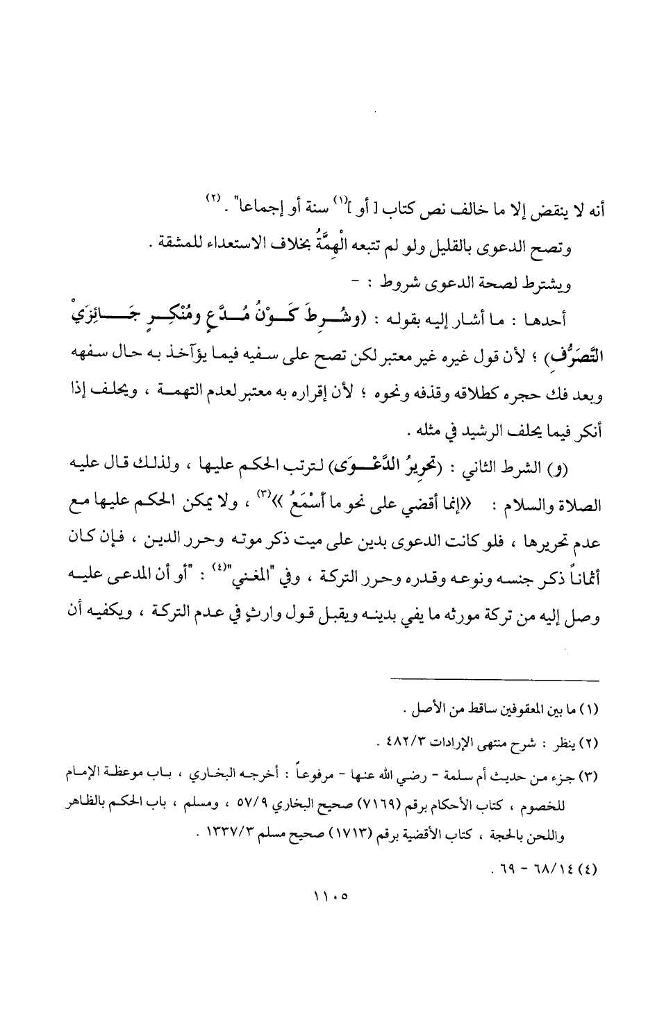 (و) الشرط الثاني: (تحرِيرُ الدَّعْوَى) لترتب الحكم عليها، ولذلك قال عليه الصلاة والسلام: "إنما أقضي على نحو ما أسْمَعُ" (¬3)، ولا يمكن الحكم عليها مع عدم تحريرها، فلو كانت الدعوى بدين على ميت ذكر موته وحرر الدين، فإن كان أثمانًا ذكر جنسه ونوعه وقدره وحرر التركة، وفي "المغني" (¬4): "أو أن المدعى عليه وصل إليه من تركة مورثه ما يفي بدينه ويقبل قول وارثٍ في عدم التركة، ويكفيه أن