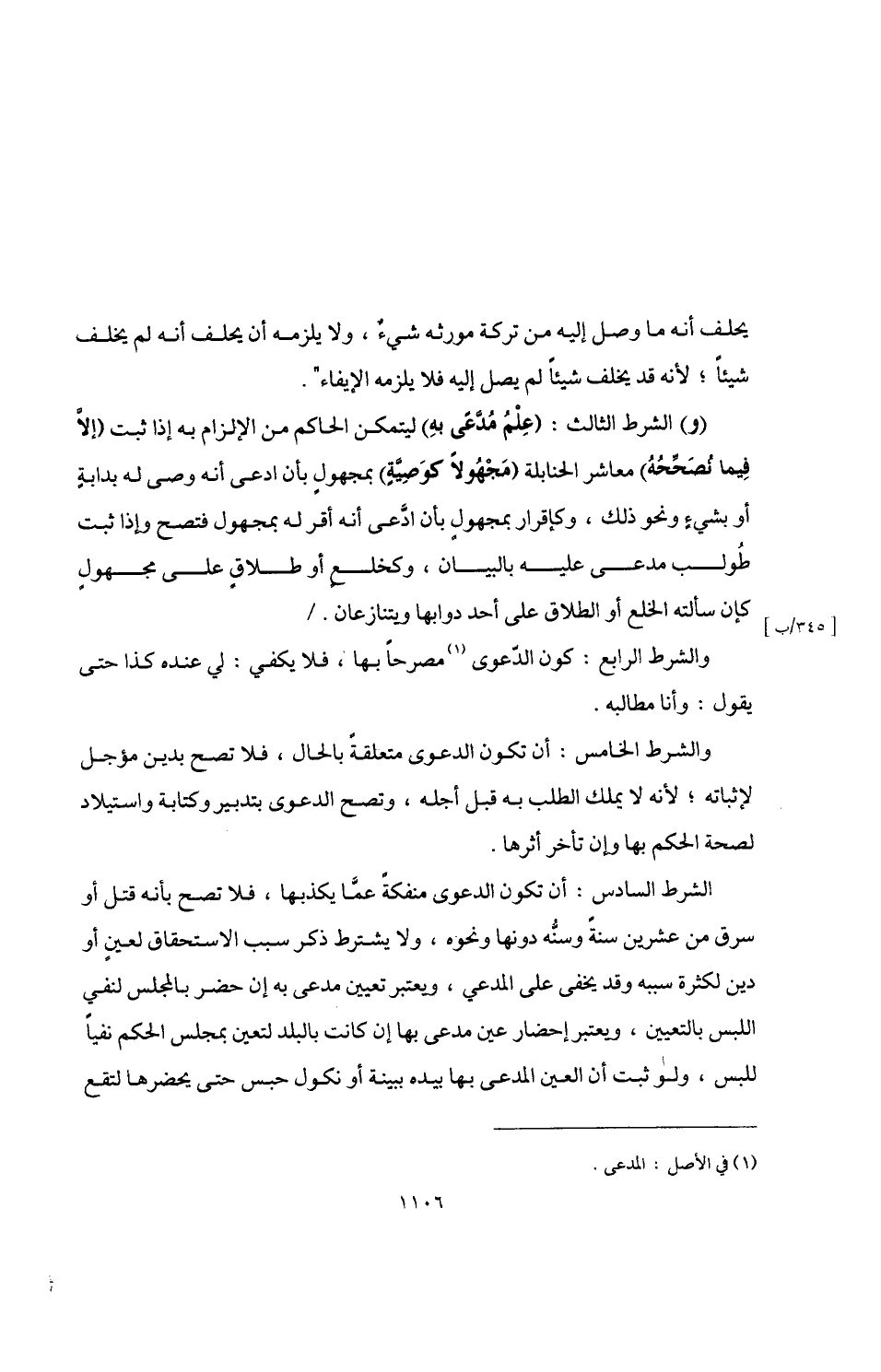 الشرط السادس: أن تكون الدعوى منفكة عمَّا يكذبها، فلا تصح بأنه قتل أو سرق من عشرين سنةً وسنُّه دونها ونحوه، ولا يشترط ذكر سبب الاستحقاق لعينٍ أو دين لكثرة سببه وقد يخفى على المدعي، ويعتبر تعيين مدعى به إن حضر بالمجلس لنفي اللبس بالتعيين، ويعتبر إحضار عين مدعى بها إن كانت بالبلد لتعين بمجلس الحكم نفيًا للبس، ولو ثبت أن العين المدعى بها بيده ببينة أو نكول حبس حتى يحضرها لتقع